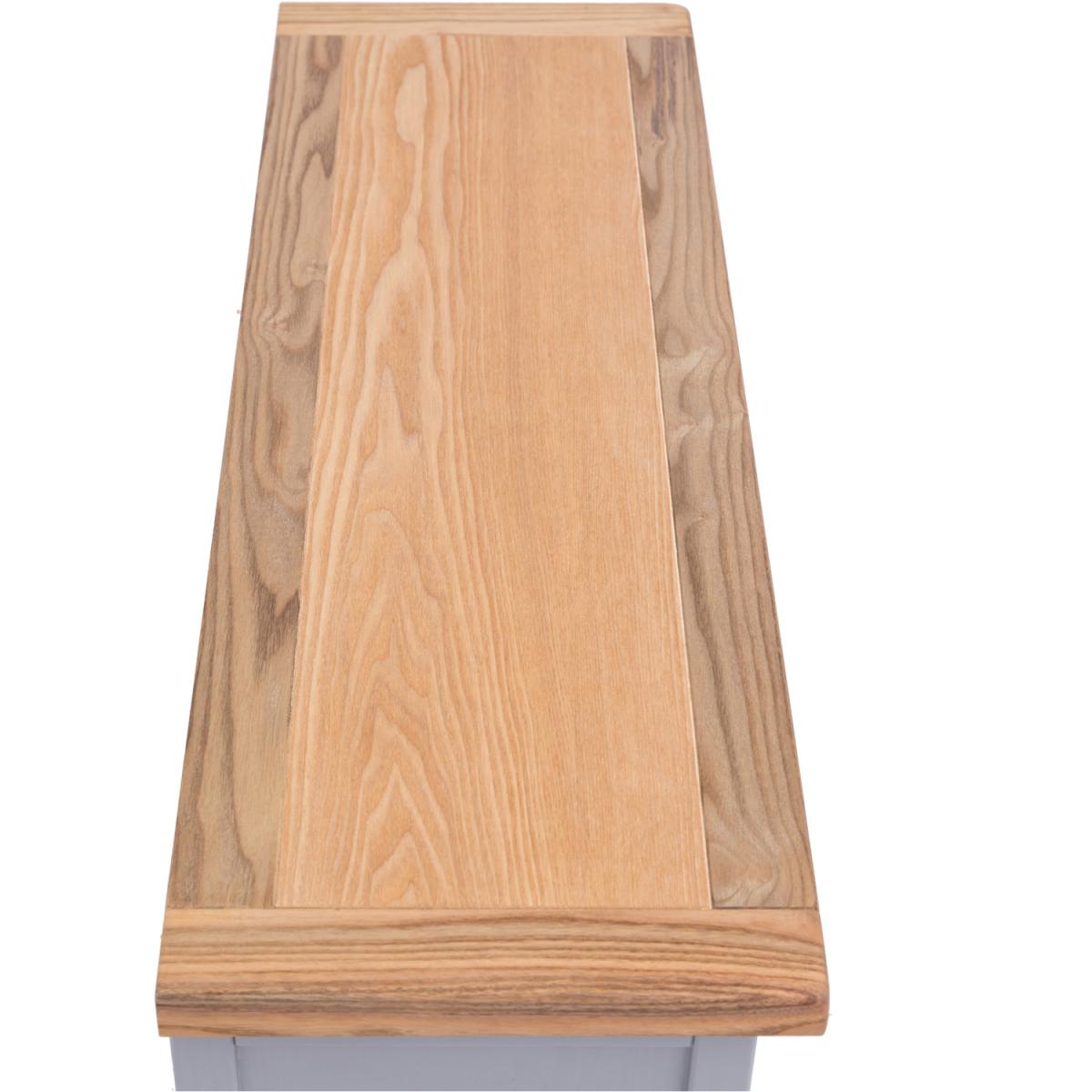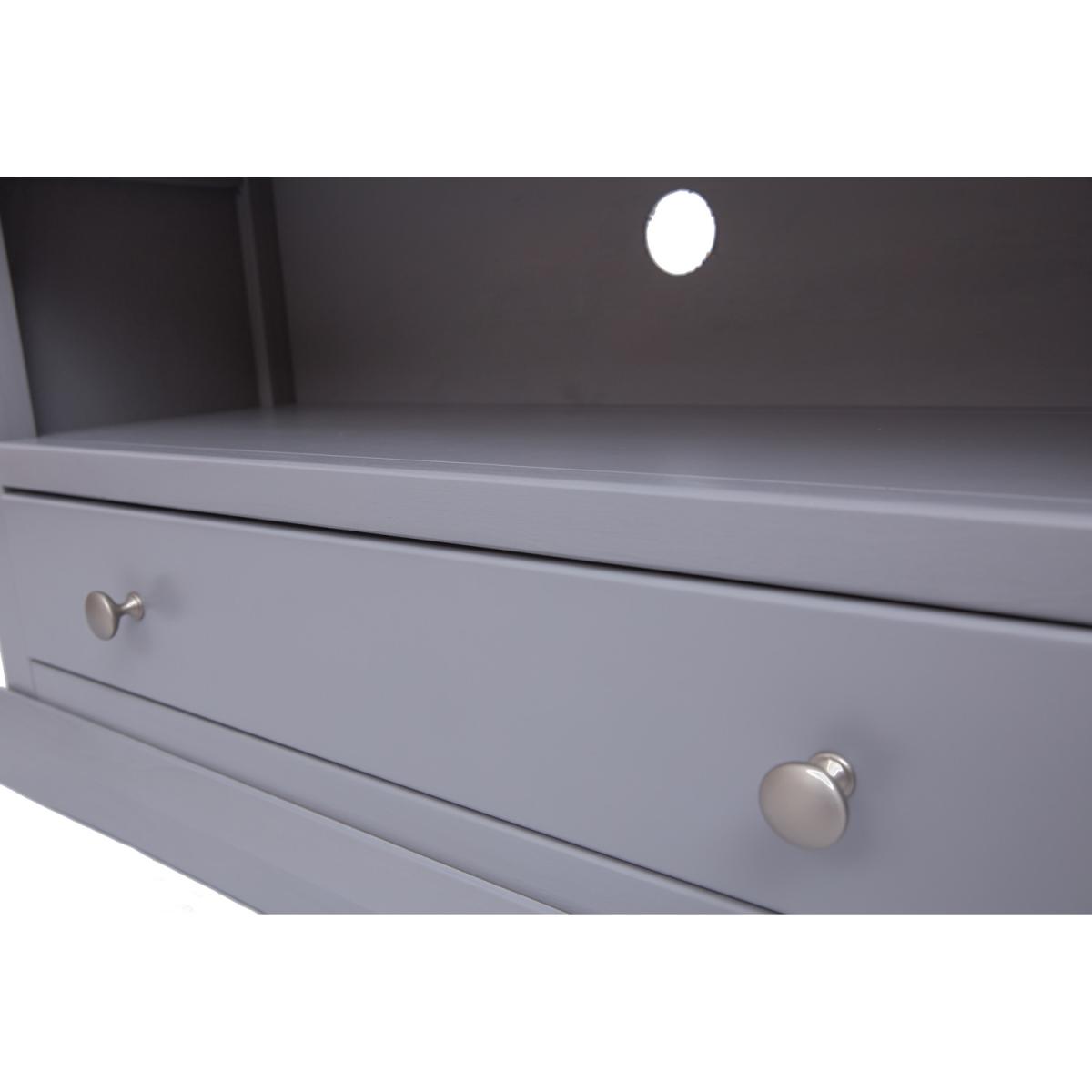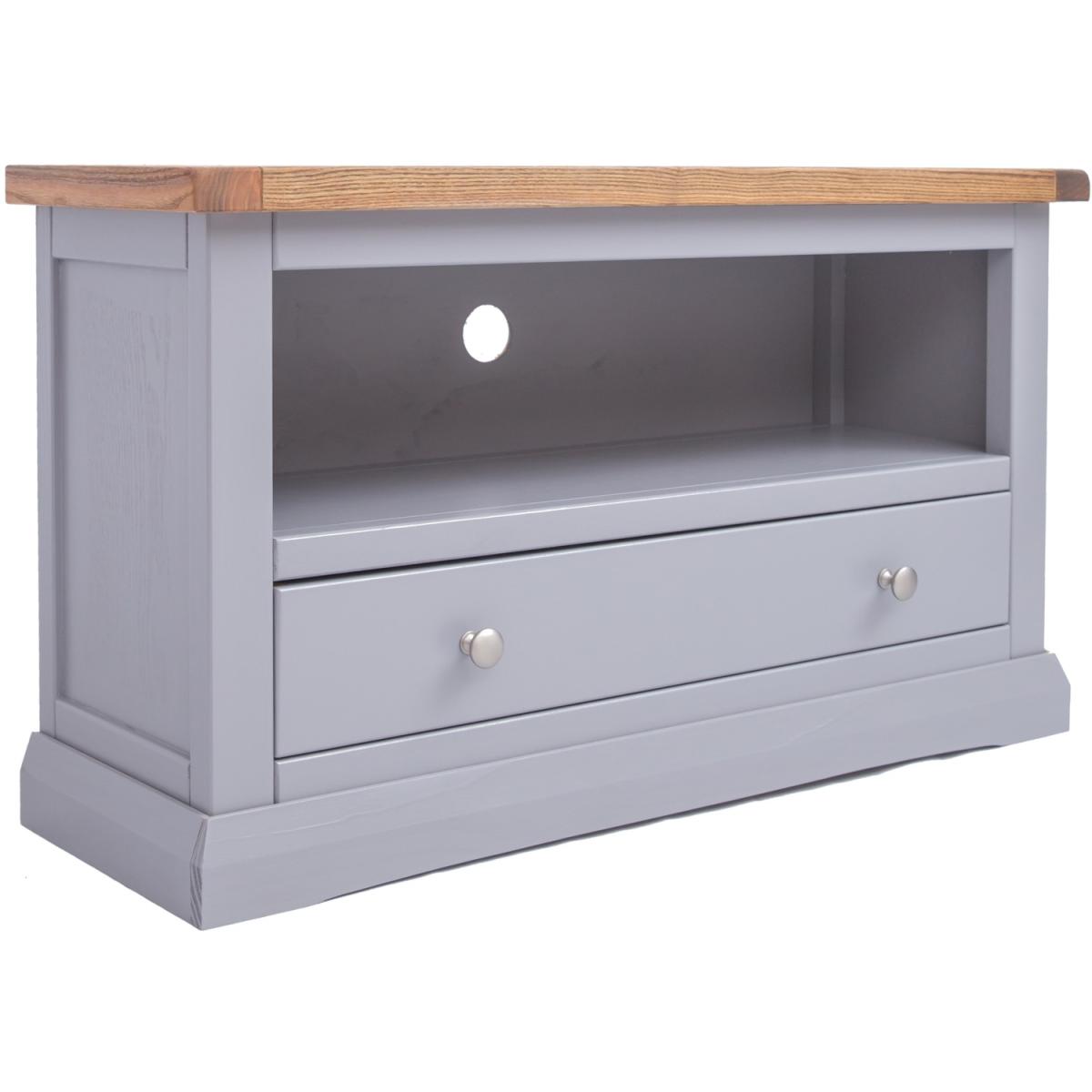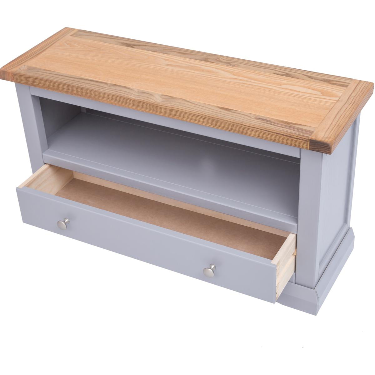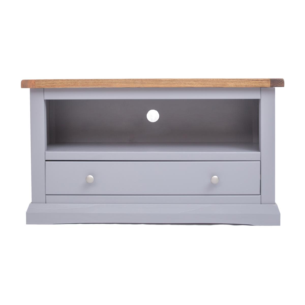 Our Rocca collection has a simple but pleasing design and is produced by our skilled craftsmen to the highest standards using responsibly sourced wood and veneers. All tops are made using a combination of hardwood and ash veneer and are carefully hand waxed giving them a great look. The body is finished with high-quality eco-friendly water-based paint in a grey colour. A compact and stylish TV unit with a full-width drawer at the bottom to store your remote controls and games consoles out of the way. Above the drawer is an open space for digital boxes or players, access for wiring is made easy by the cable holes cut out in the back of the unit.