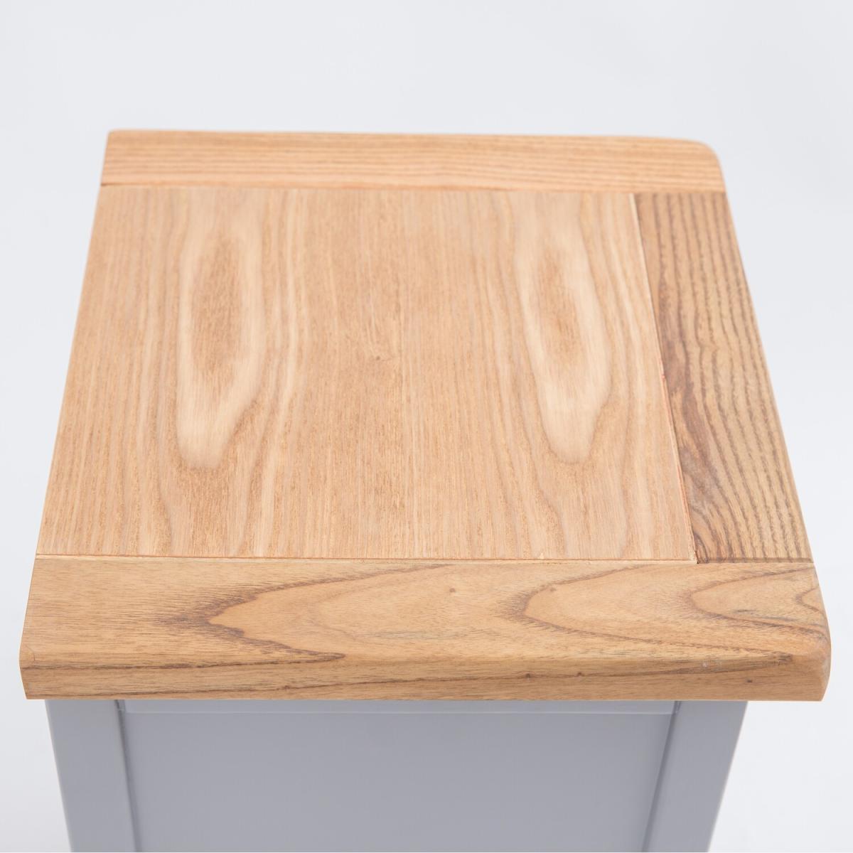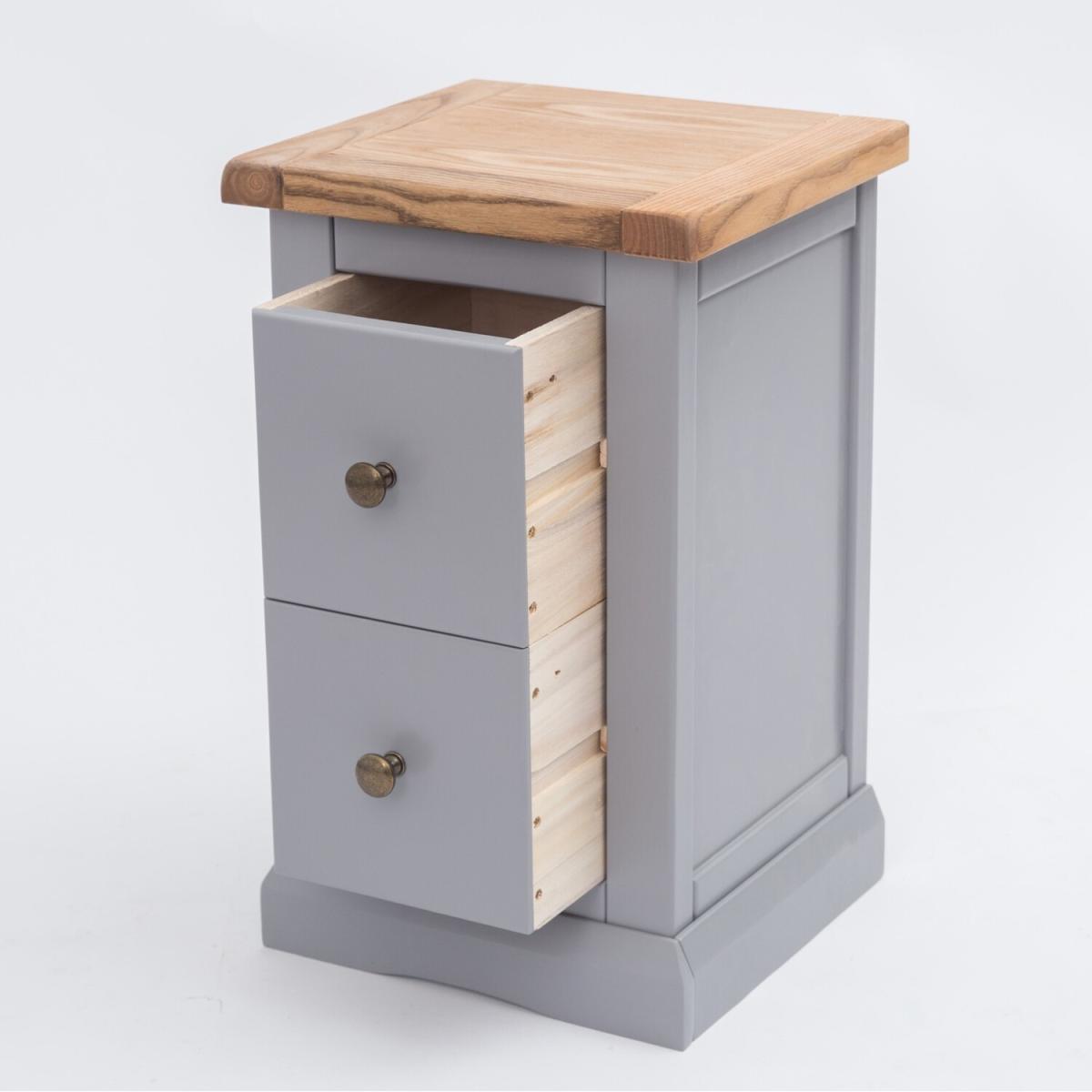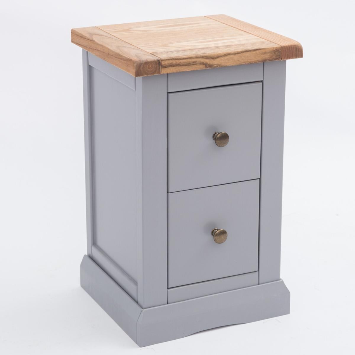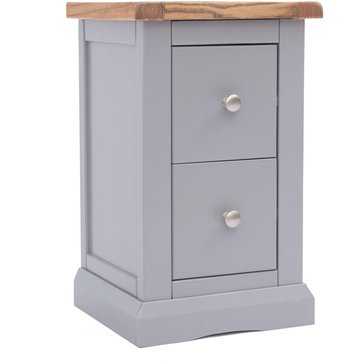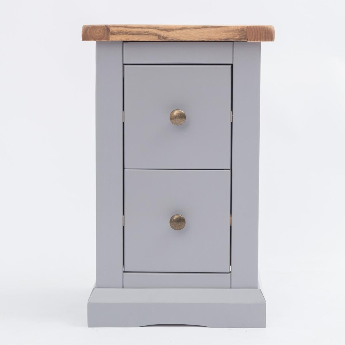 Our Mirano collection has a simple but pleasing design and is produced by our skilled craftsmen to the highest standards using responsibly sourced wood and veneers. All tops are made using a combination of hardwood and ash veneer and are carefully hand waxed giving it a great look. The body is finished with a high quality eco friendly water base paint on an dark grey colour. This 2 drawer petite bedside is a perfect addition for your bedroom, giving you plenty of storage space. It has two drawers that can be fitted with a chrome or an antique brass knob, giving it great flexibility to fit it into your existing room set, and a good size top to keep your favourite books or display your ornaments. These attributes combined with a simple construction for easy assembly makes it a great value product to be taken home today.
