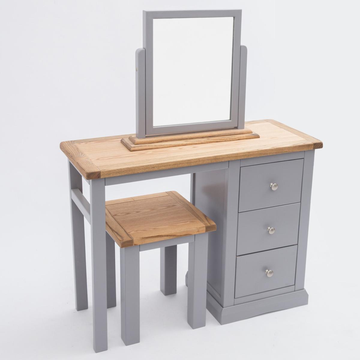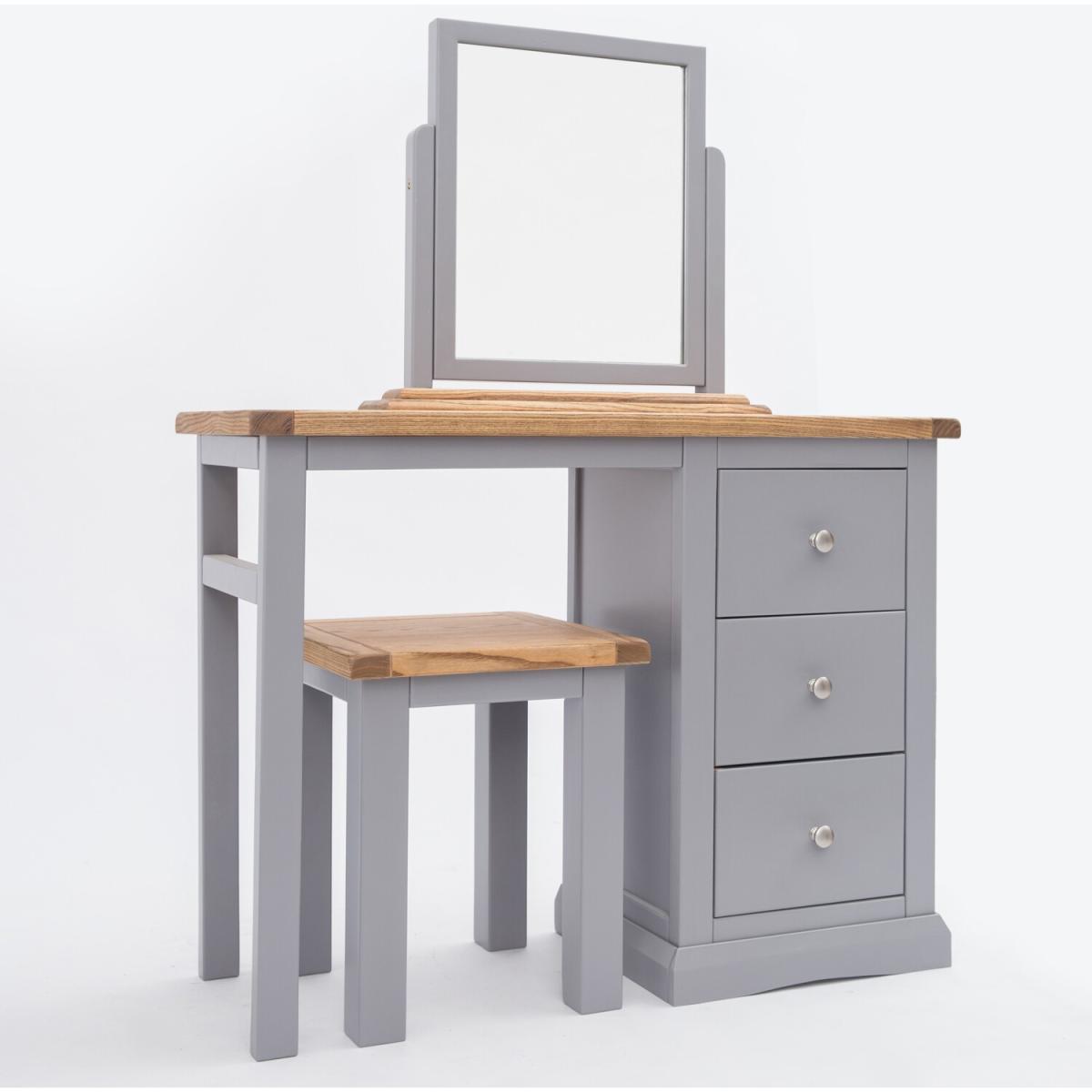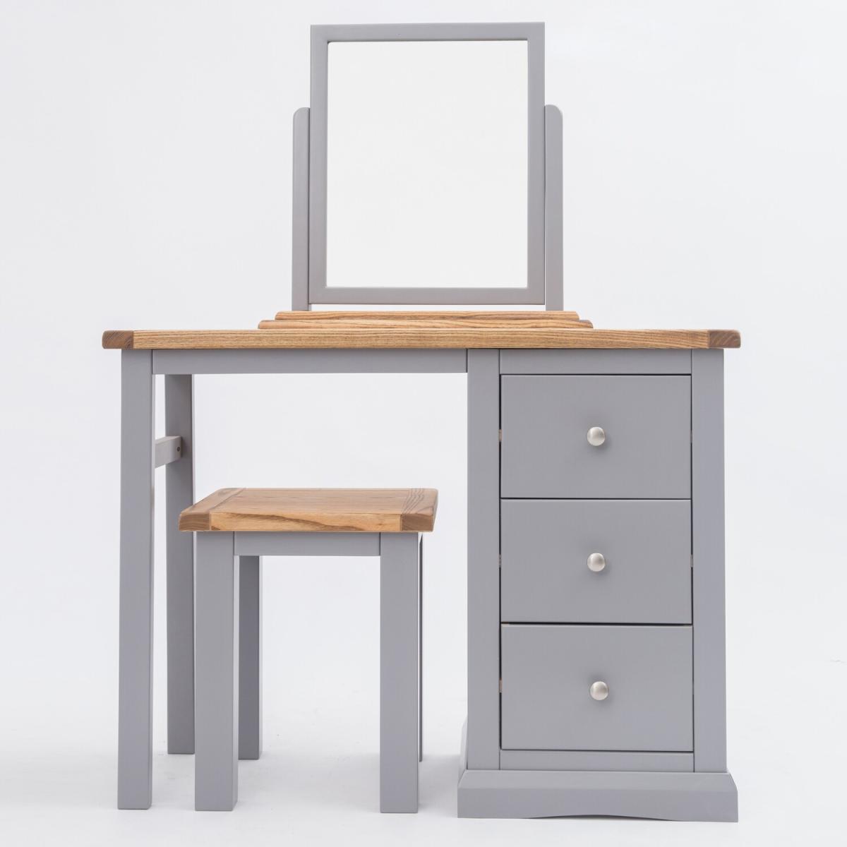 Our Rocca collection has a simple but pleasing design and is produced by our skilled craftsmen to the highest standards using responsibly sourced wood and veneers. All tops are made using a combination of hardwood and ash veneer and carefully hand waxed, giving them a great look. The body is finished with a high-quality eco-friendly water base paint in a grey colour. A versatile 3-drawer dressing table set, the perfect multifunctional piece for your bedroom. The 3 drawers offer plenty of space for your belongings. The pedestal part can be positioned to the left or right-hand side when assembling. The mirror and stool are individual pieces and can be used with the dresser or separately. These attributes combined with a simple construction for easy assembly make it a great value product to be taken home today.