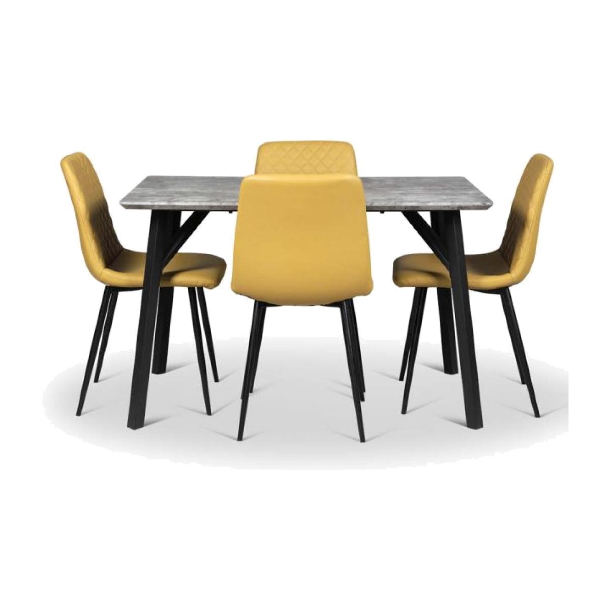 Stylish and practical our dining bundle of the Rocca Dining Table and four Ripley Dining Chairs in Mustard is a great show of industrial style. With concrete effect finish the table features soft round edges and is complimented by the angled black metal legs, giving it a modern industrial feel. Paired with the Ripley chairs that are upholstered in a faux leather fabric with diamond quilted back detail and sit on top of modern black metal legs this set together would be perfect for any modern kitchen or dining room.