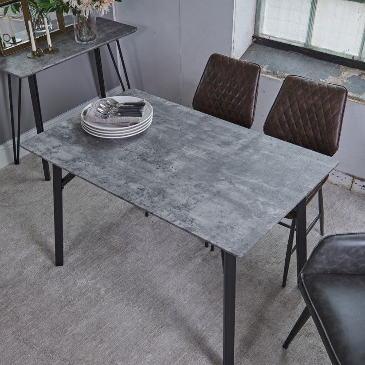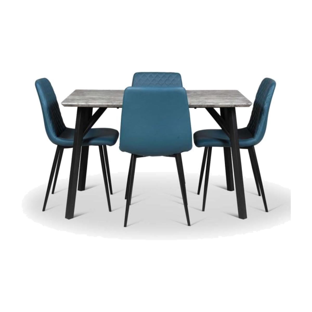 Stylish and practical our dining bundle of the Rocca Dining Table and four Ripley Dining Chairs in Teal is a great show of industrial style. With concrete effect finish the table features soft round edges and is complimented by the angled black metal legs, giving it a modern industrial feel. Paired with the Ripley chairs that are upholstered in a faux leather fabric with diamond quilted back detail and sit on top of modern black metal legs this set together would be perfect for any modern kitchen or dining room.