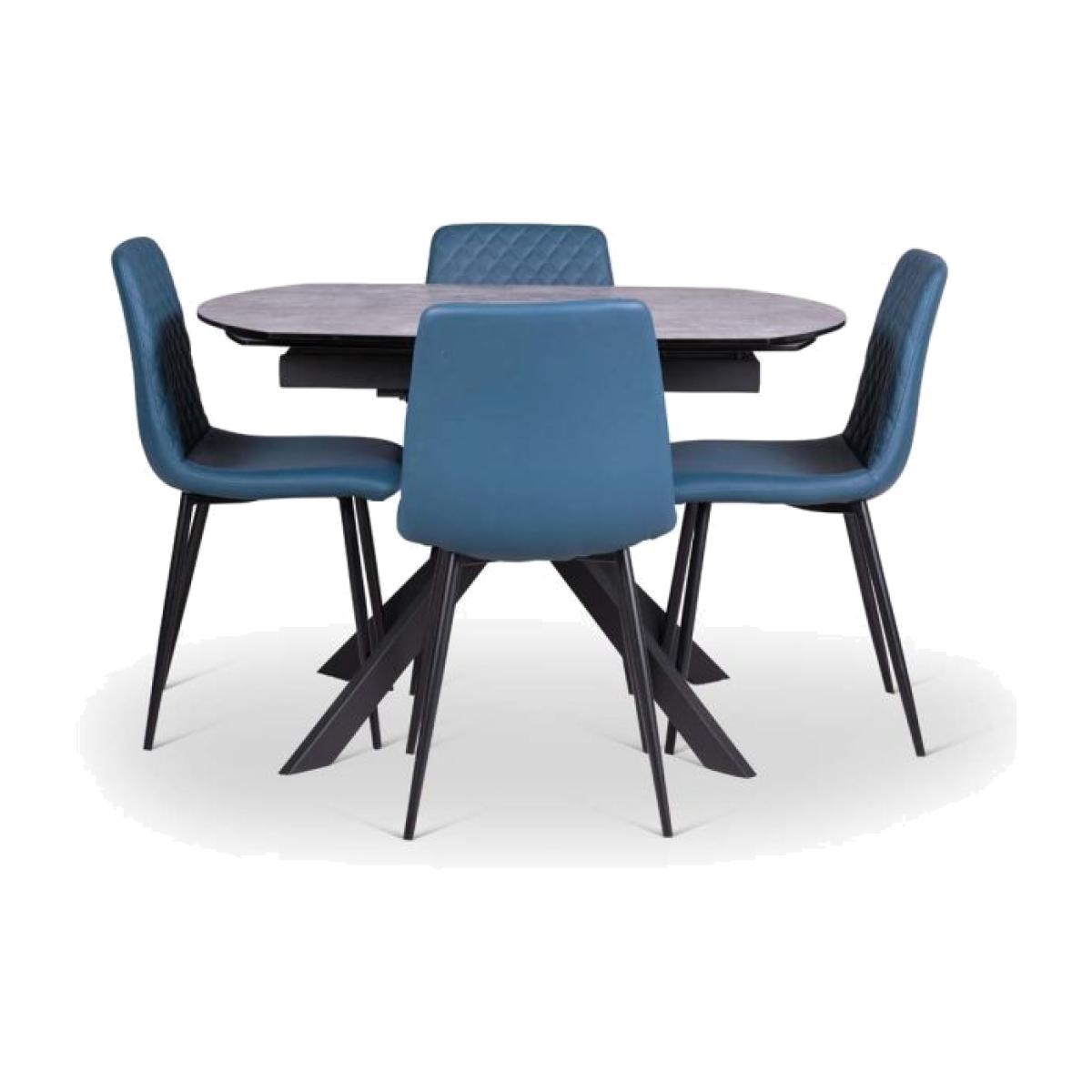 Industrial style combined with perfect flexibility is offered with this dining bundle of our Rocca Motion Dining Table and four Ripley Dining Chairs in Teal. The table extends with a smooth motion of turning the centre platter and features a durable coated glass top with a concrete effect finish. The table is topped off with a stunning star formation black metal leg creating a cool industrial feel. The popular Ripley chairs are upholstered in a faux leather fabric with diamond quilted back detail and sit on top of modern black metal legs. The set together would be perfect for any modern kitchen/diner.