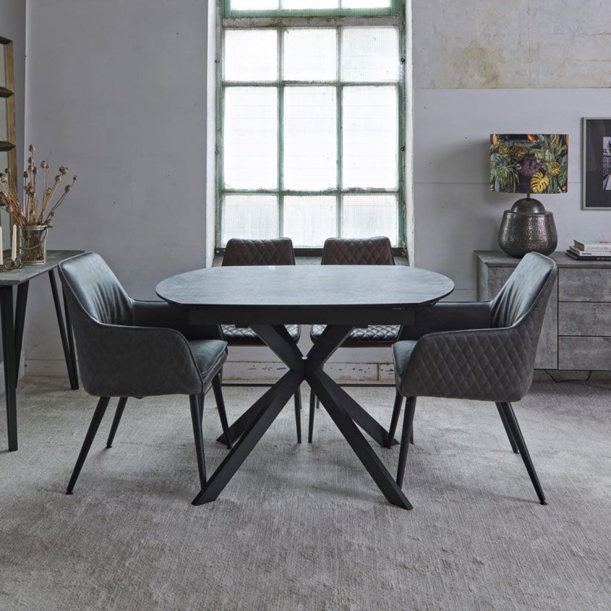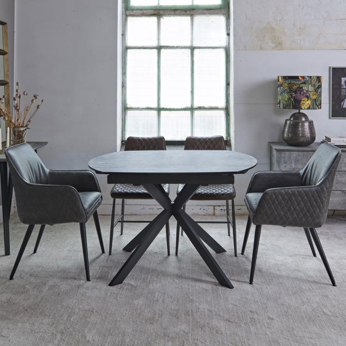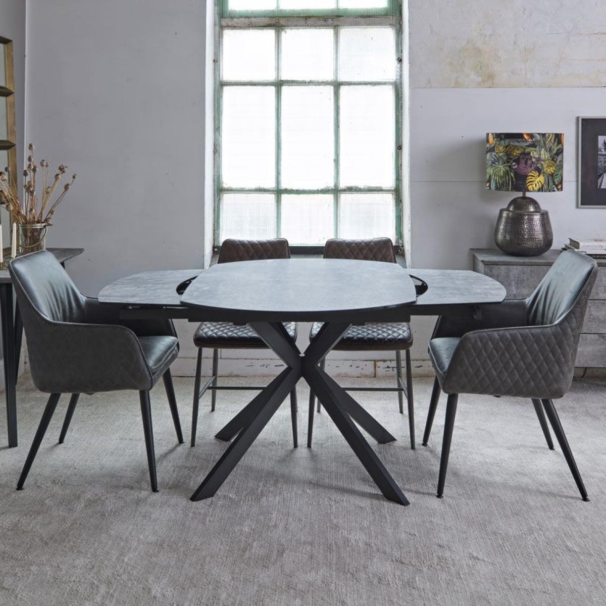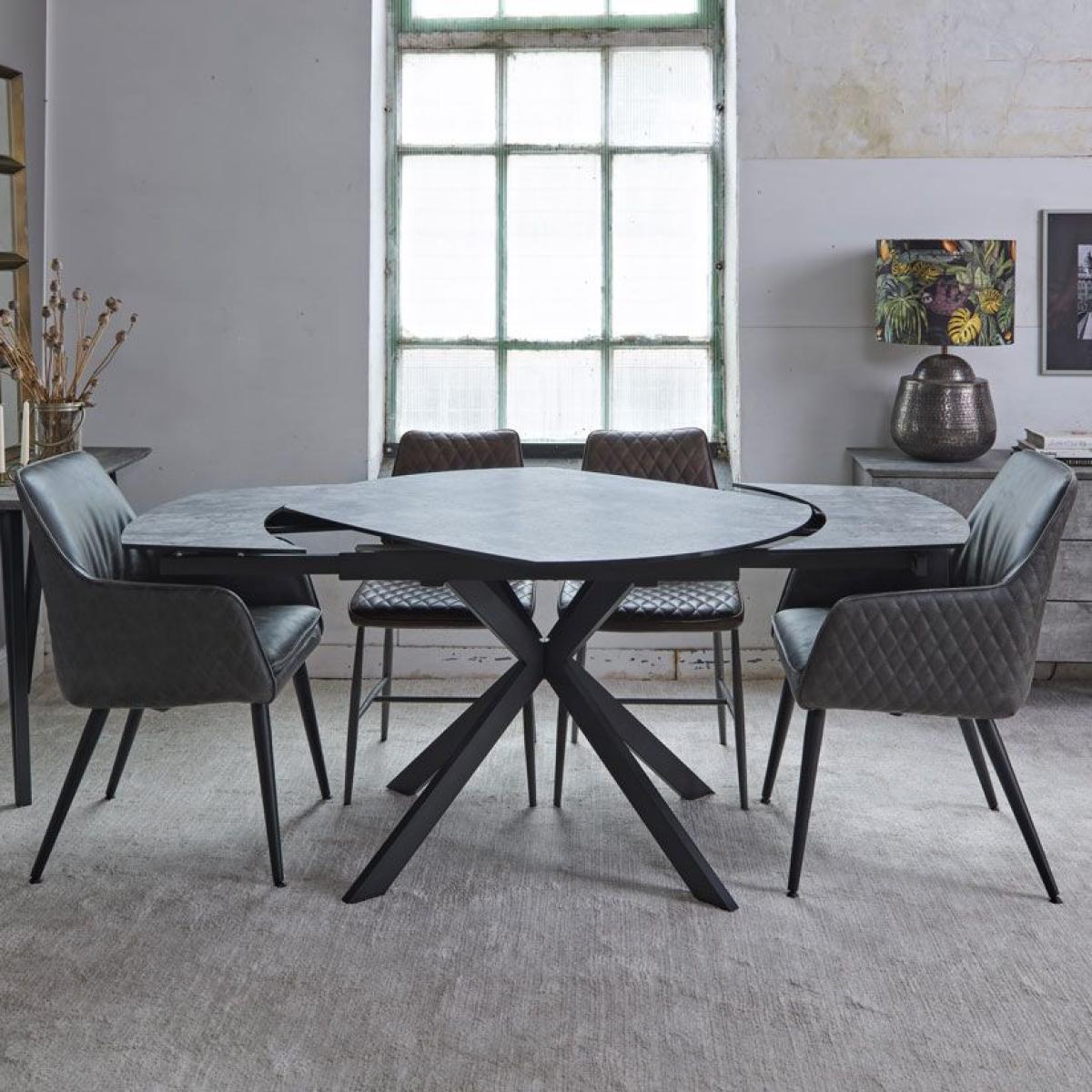 The Rocca motion dining table makes a fun and versatile addition to your kitchen or dining room. With its easy to extend feature, simply twist the table top to allow for additional guests to join you. Made up of a concrete effect top and black metal legs its sure to modernize your home with next to no effort required. Team with the rest of the Rocca living and dining furniture collection to complete the look.