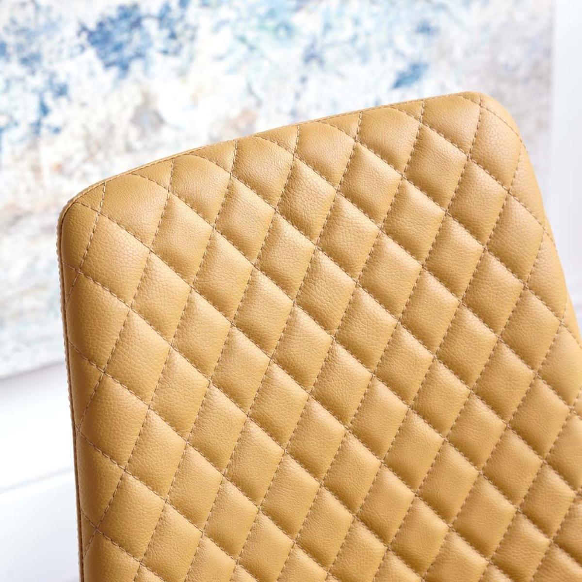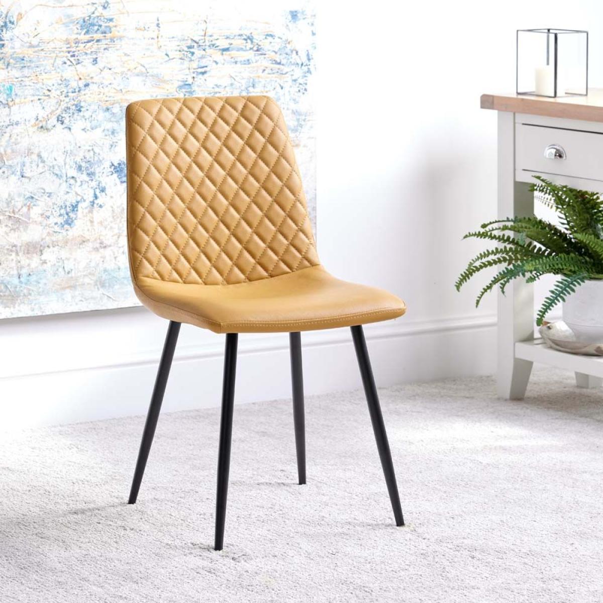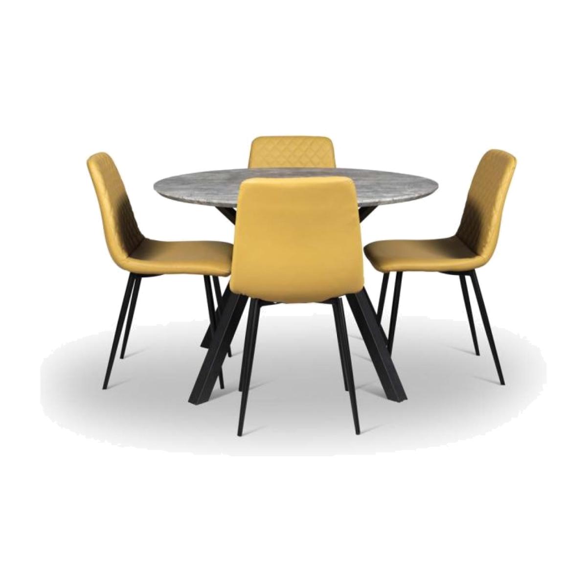 Gather together around our dining bundle of the Rocca Round Dining Table and four Ripley Dining Chairs in Mustard. With concrete effect finish this table is perfectly proportioned to seat four, and the angled black metal legs give it a modern industrial feel ready to fit into any contemporary home. Paired with the Ripley chairs that are upholstered in a faux leather fabric with diamond quilted back detail and sit on top of modern black metal legs this set together would be perfect for any modern kitchen or dining room.