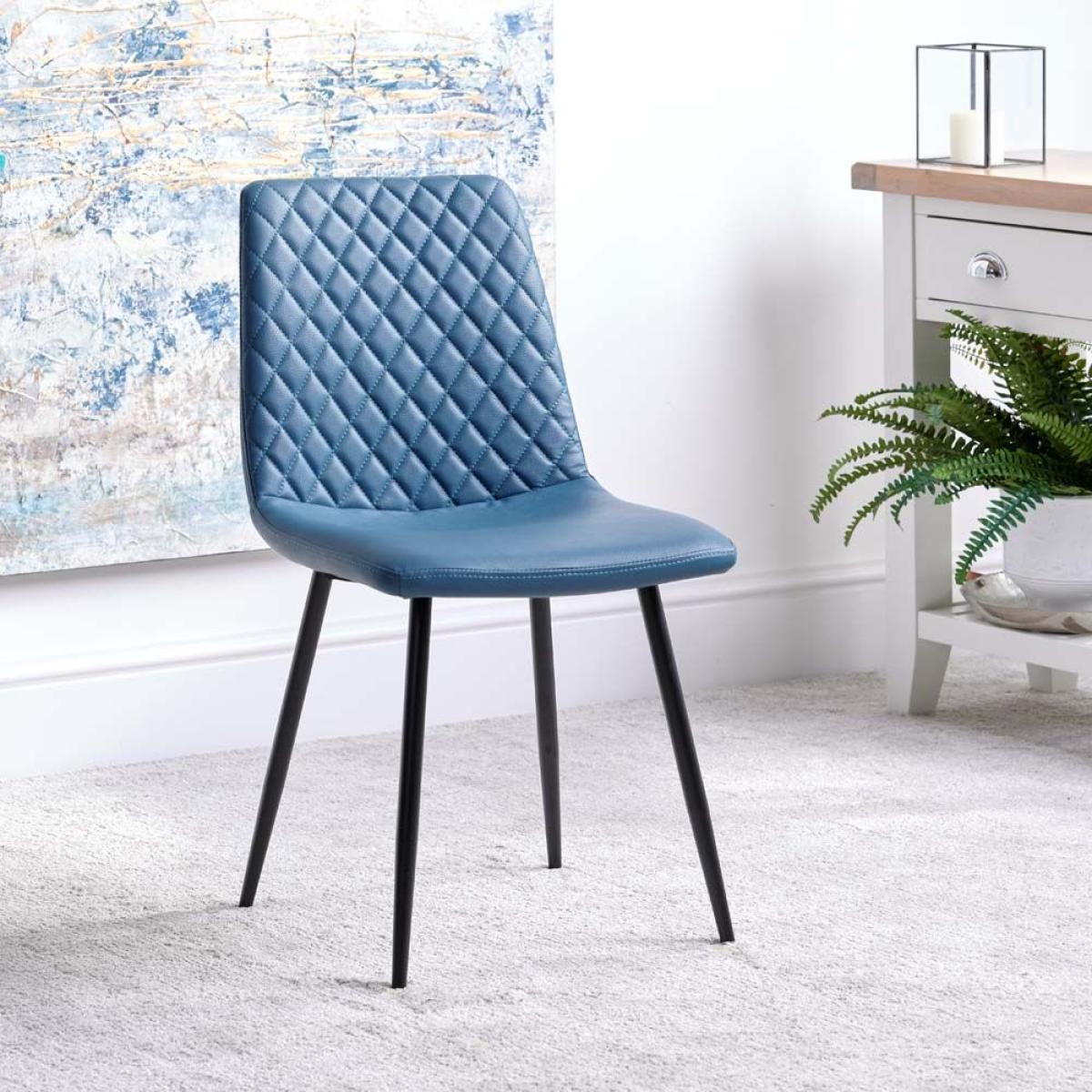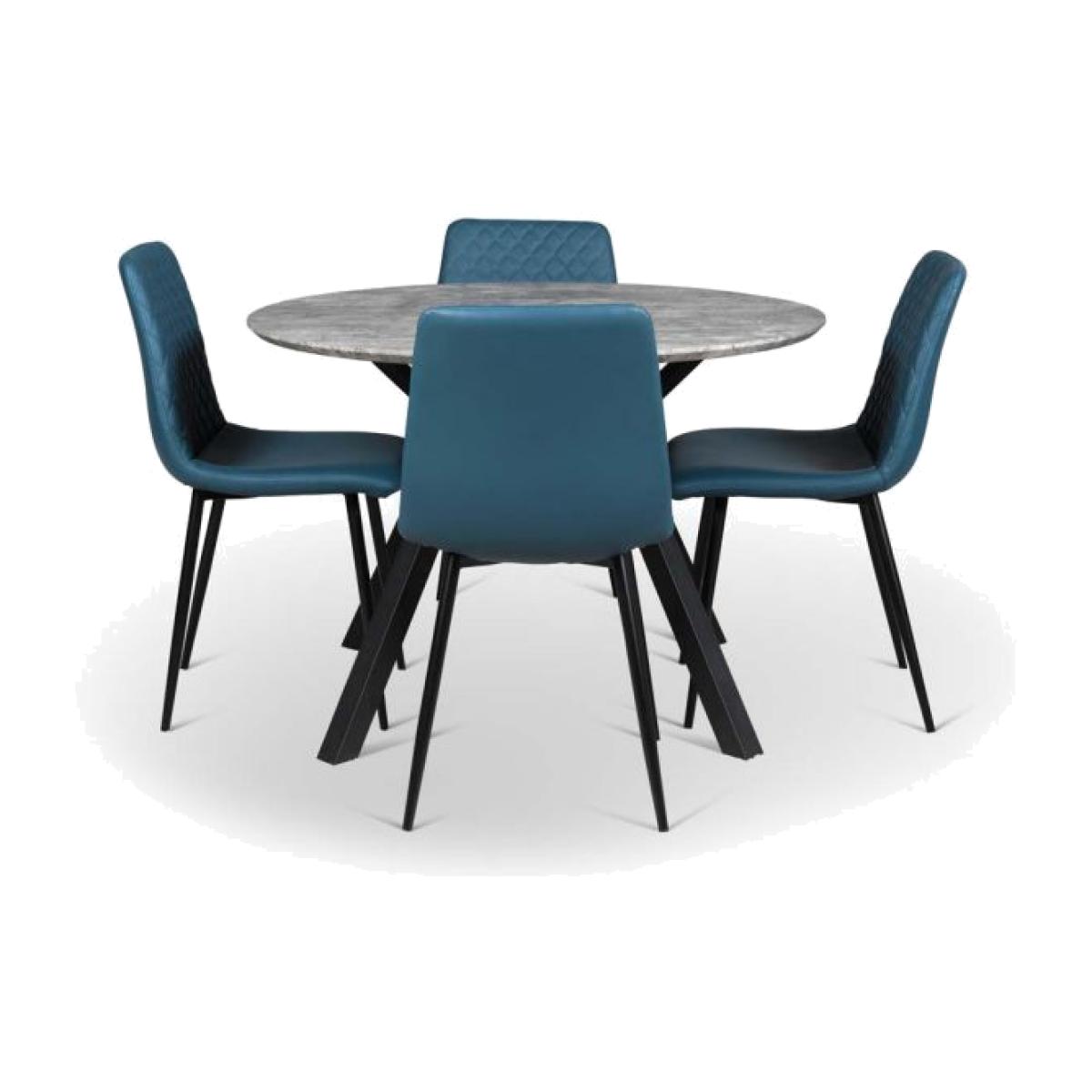 Gather together around our dining bundle of the Rocca Round Dining Table and four Ripley Dining Chairs in Teal. With concrete effect finish this table is perfectly proportioned to seat four, and the angled black metal legs give it a modern industrial feel ready to fit into any contemporary home. Paired with the Ripley chairs that are upholstered in a faux leather fabric with diamond quilted back detail and sit on top of modern black metal legs this set together would be perfect for any modern kitchen or dining room.