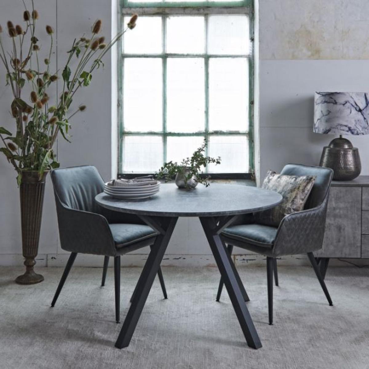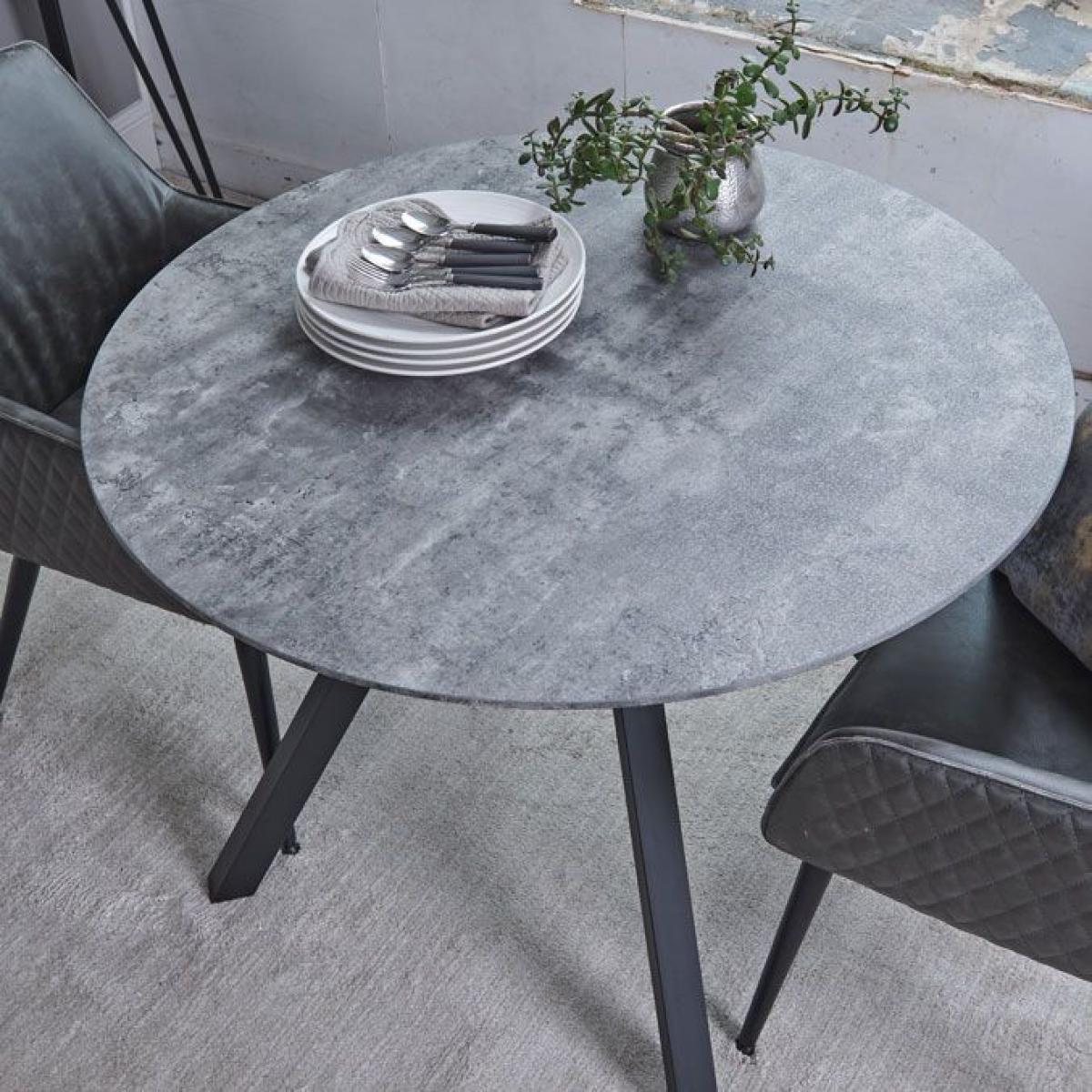 Gather together around the Rocca round concrete effect table, its compact size makes it suitable for both your kitchen and dining room. Made up of a concrete effect top and angled black metal legs for a modern design. Team this concrete effect table with the rest of the Rocca living and dining furniture collection to complete the look.