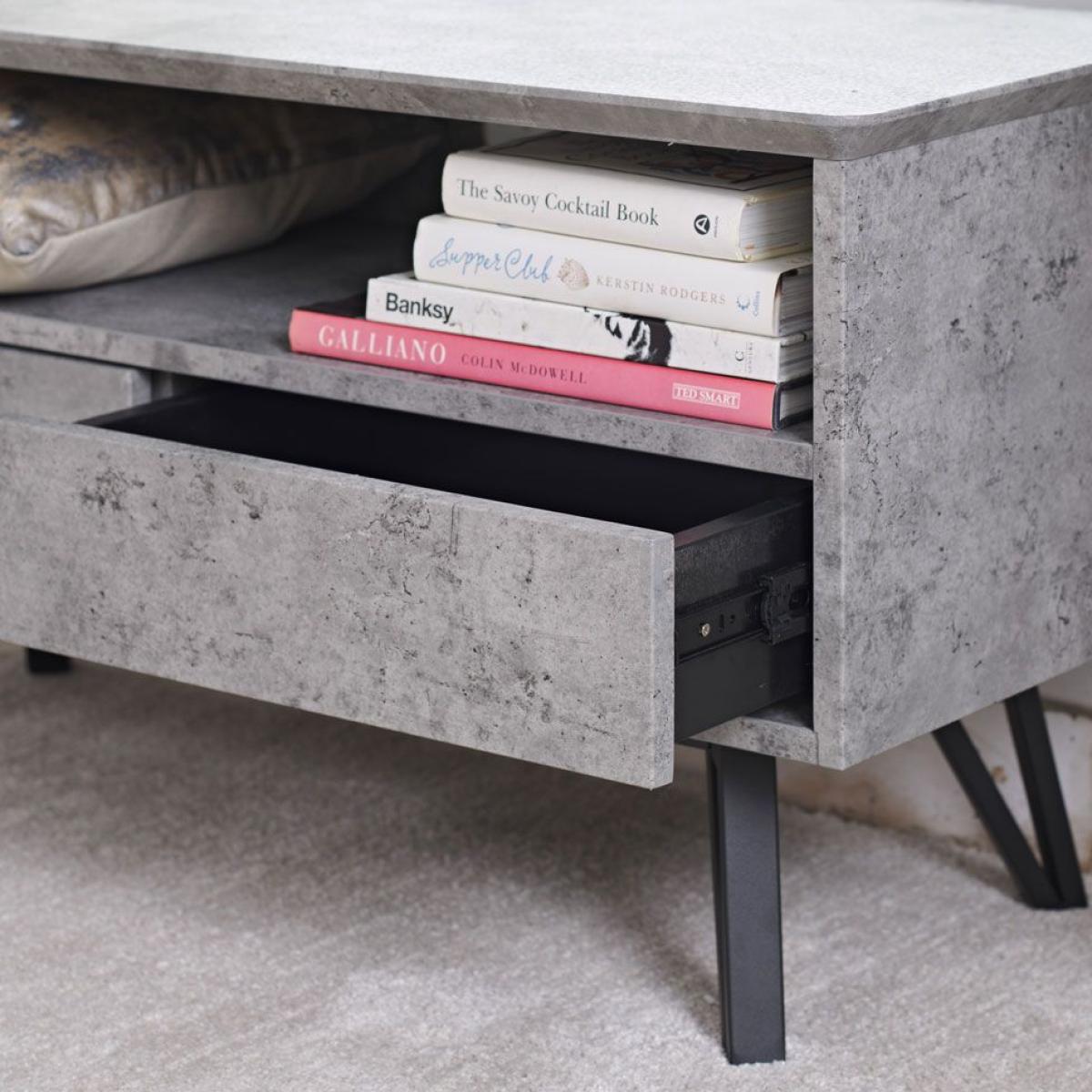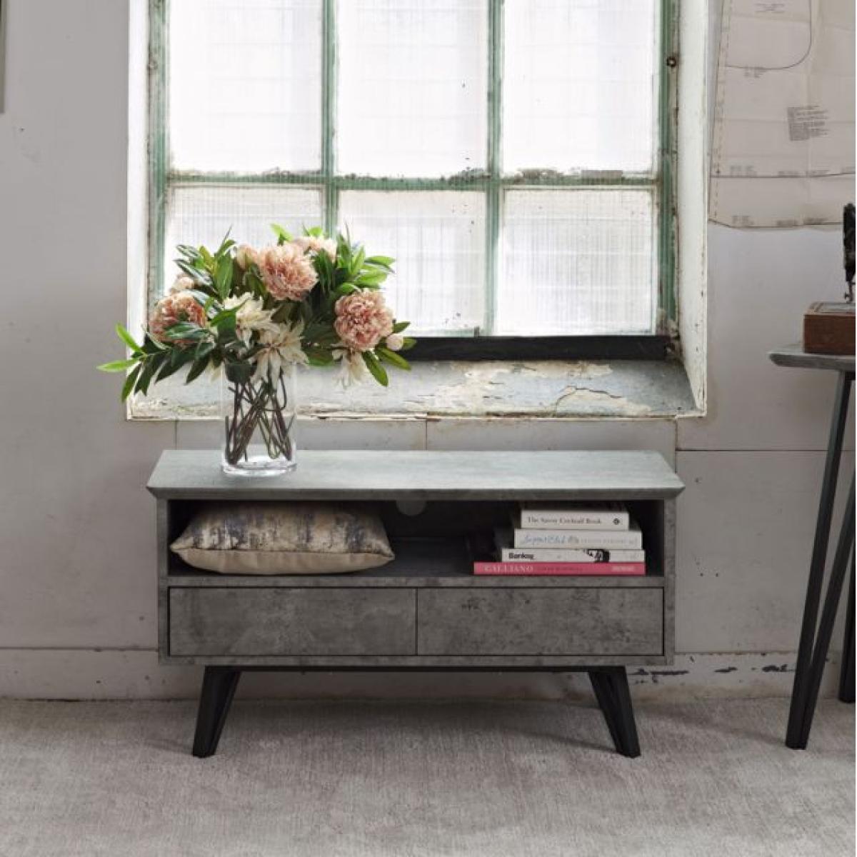 House your tv and entertainment system in the stylish Rocca TV cabinet, complete with a hole in the back of the shelving space to thread wires through and two drawer spaces for rogue remotes, batteries and anything else you might want to store away. Made up of a concrete effect finish and black metal legs for a modern, industrial inspired design.