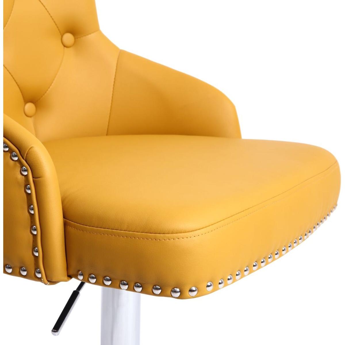 A gorgeous bar stool enhanced by attractive stud detail edging and tufted button back. Upholstered in yellow leather effect. Height adjustable up to 127cm. Complete with comfortable chrome footrest and base.