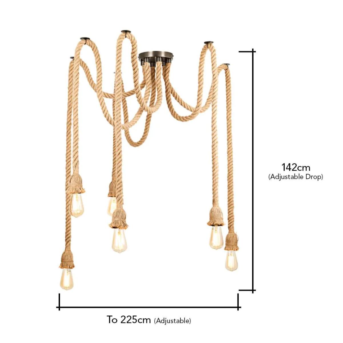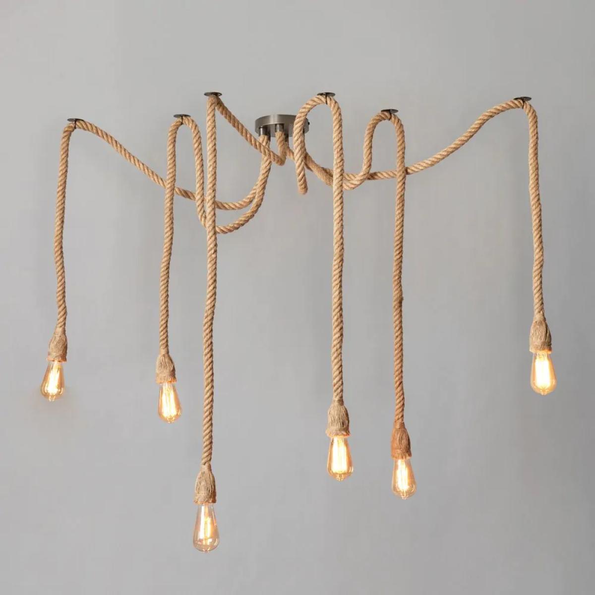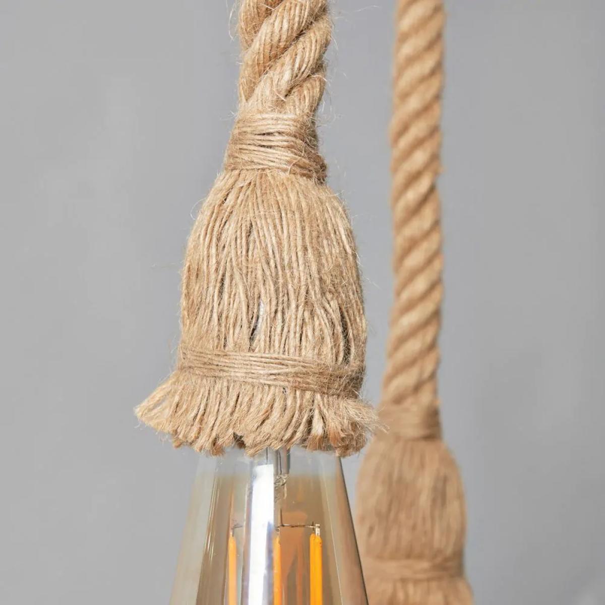 The Roch 6 Light Ceiling Pendant Rope Cable Kit features six pendant lights suspended from a natural rope, providing a rustic, farmhouse element to your lighting arrangement and your home. This ceiling light comes with a hook and loop fixing kit to attach the ropes to the ceiling, allowing you to customise this light to suit your home and preference. While the exposed bulbs project a warm glow from each pendant creating a cosy and inviting atmosphere, perfect for dining areas, living rooms, or any space needing a focal point.