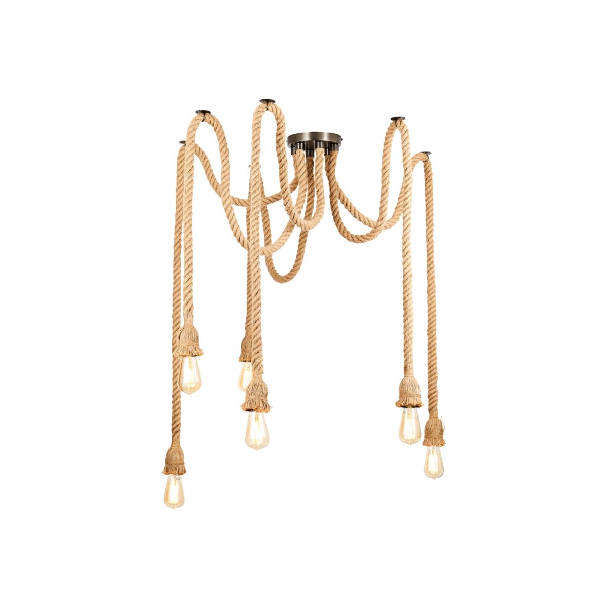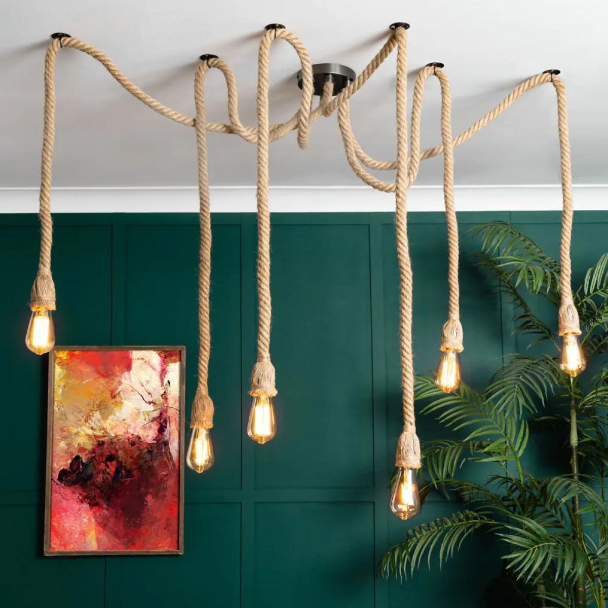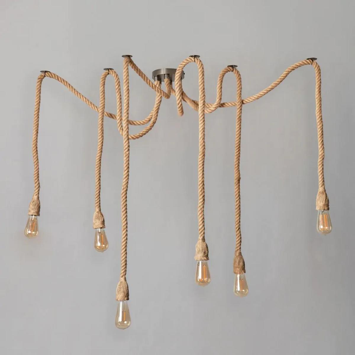 The Roch 6 Light Ceiling Pendant Rope Cable Kit features six pendant lights suspended from a natural rope, providing a rustic, farmhouse element to your lighting arrangement and your home. This ceiling light comes with a hook and loop fixing kit to attach the ropes to the ceiling, allowing you to customise this light to suit your home and preference. While the exposed bulbs project a warm glow from each pendant creating a cosy and inviting atmosphere, perfect for dining areas, living rooms, or any space needing a focal point.