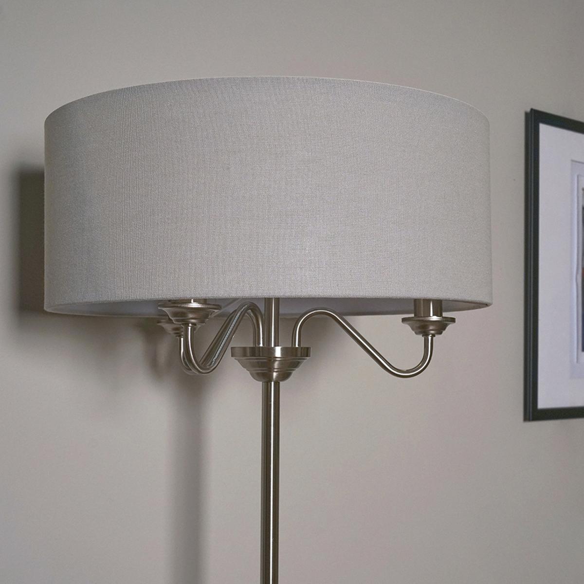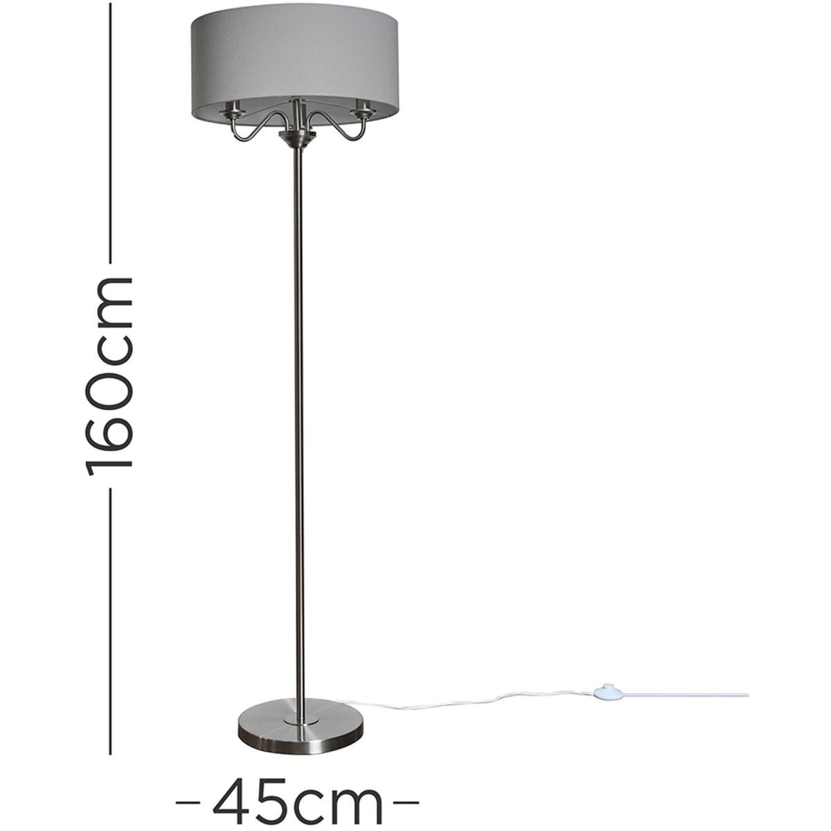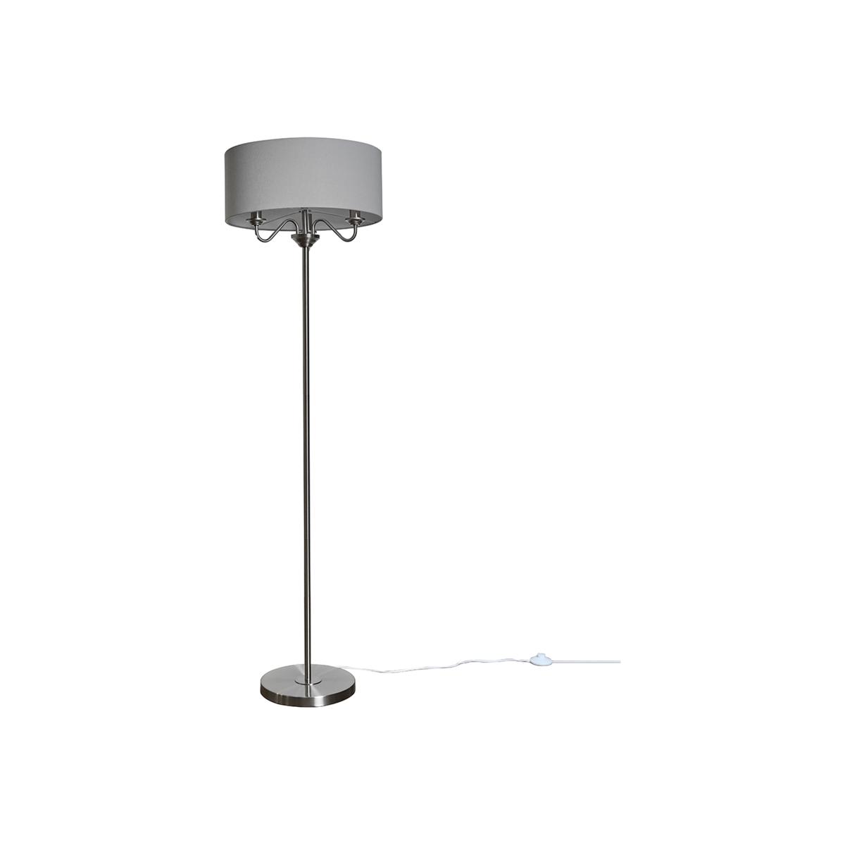 This modern twist to a traditional floor lamp is guaranteed to make a statement in any home. It features a stunning elegant designer style 3 way curved multi arm design in a chrome metal finish. Complete with a grey linen slimline drum light shade. Floor lamps are a great way to bring additional lighting to a room and are particularly useful to illuminate a dull corner. Ideal for lounges, dining rooms, bedrooms and other living areas.