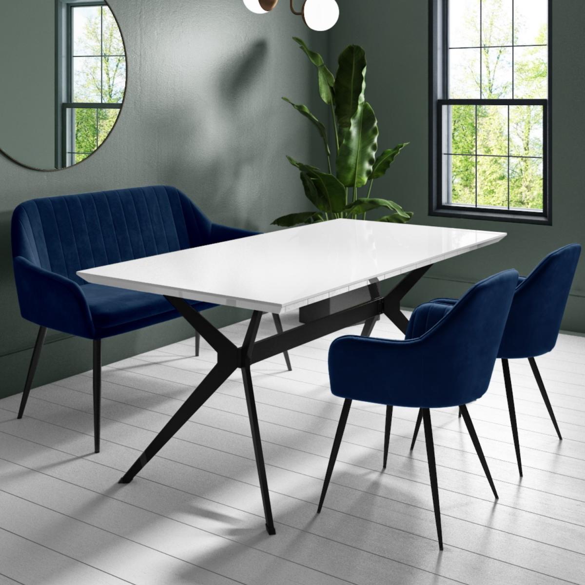 Complete your dining room with a pair of. Logan dining chairs. With an on trend design, the styling is effortless. They feature curved chair backs with stunning black metal chair legs. Finished innavy blue velvetand black, the two tone design brings a fresh look to your space with a modern touch. Crafted from navy blue velvet & black metal they are highly durable and hardwearing, easily withstanding the test of time in a busy family dining room. These chairs are supplied in pairs, the chairs will require self-assembly.