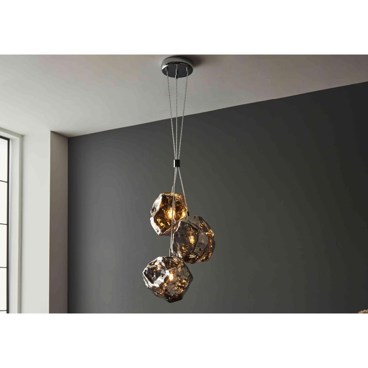 The Rock pendant is an artistic concept for contemporary interiors. Its unique design takes inspiration from volcanic rock formations. Why you'll love it. A stylish statement for small or medium-sized rooms. Modern chandelier with a metallic finish. Mouth-blown glass distributes light beautifully. Great ambience and industrial feel. Made with care for Furniture Village. What you need to know. Chrome-plated steel base. Metallic glass shades. 3 x 10W LED E27 bulb required. Dimmable. Dimensions. Width: 42cm (17 inches). Height: 101cm (40 inches).