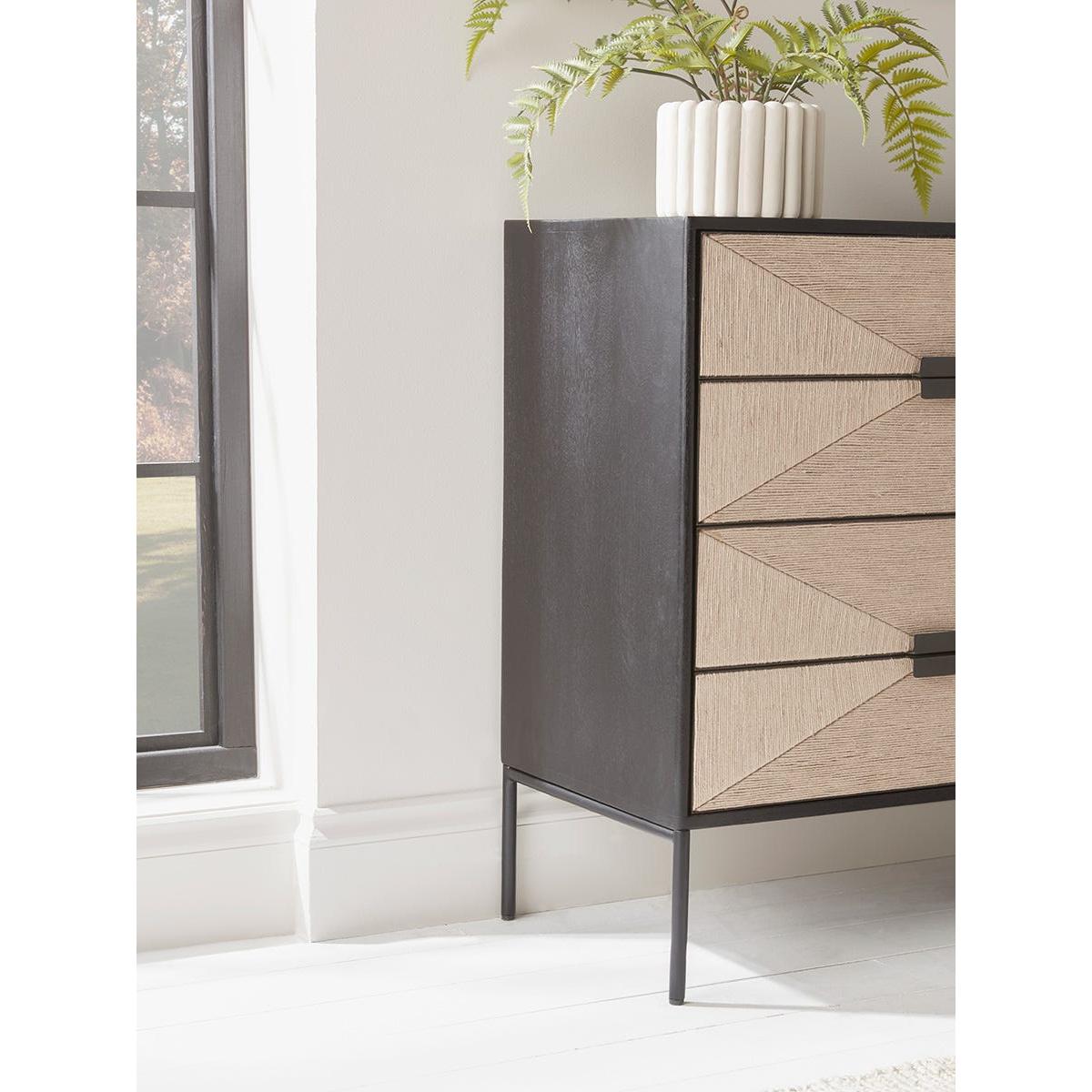 Providing a striking contrast of dark wood and natural jute, our Rockaway collection offers an authentic textural look that will elevate a neutral scheme for a more sophisticated look. The jute rope panels to the drawer fronts form geometric shapes which create further contrast, as the light catches the different angles. Our chest of drawers is a wide piece, with four drawers offering substantial storage space. View our full Rockaway range.