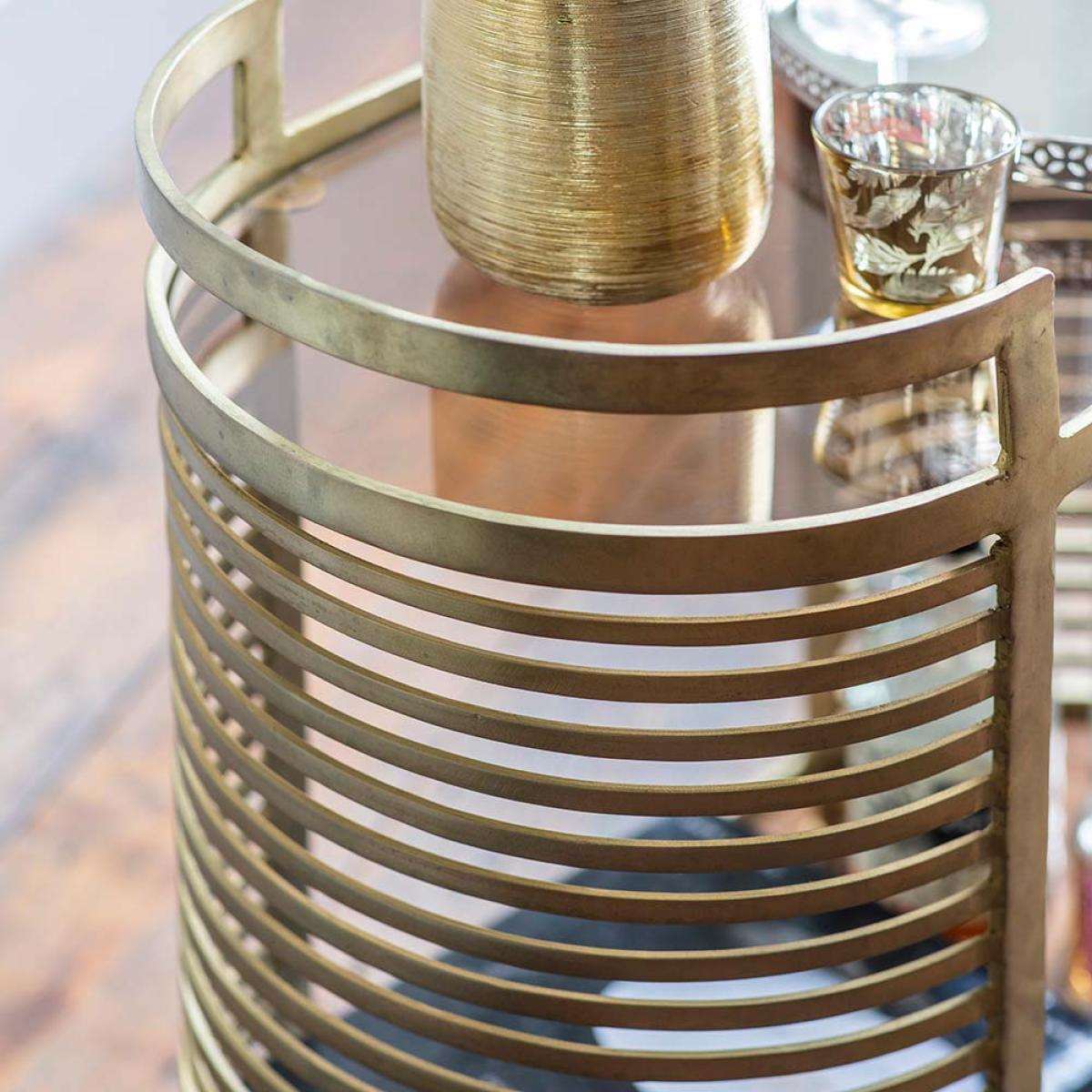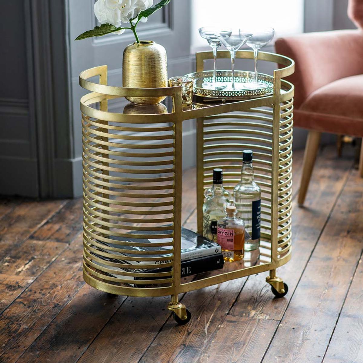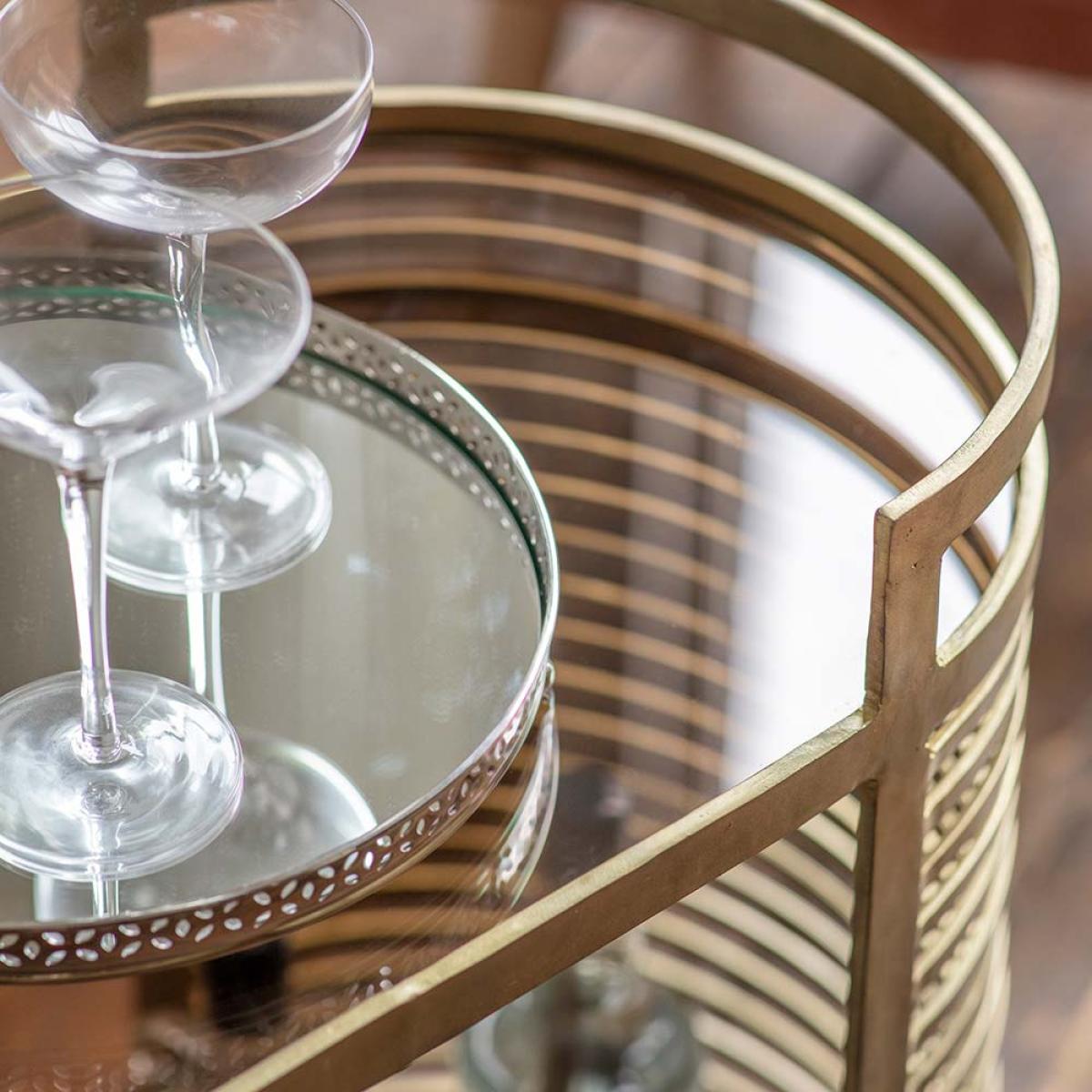 Functional and stylish with a glamorous Art Deco vibe, our new Rockefeller Drinks Trolley is perfect for those who love to entertain. With plenty of room for drinks, decanters and glasses, this mobile trolley is crafted from a brass plated metal frame with amber glass shelving while its curvaceous design is ergonomic too.