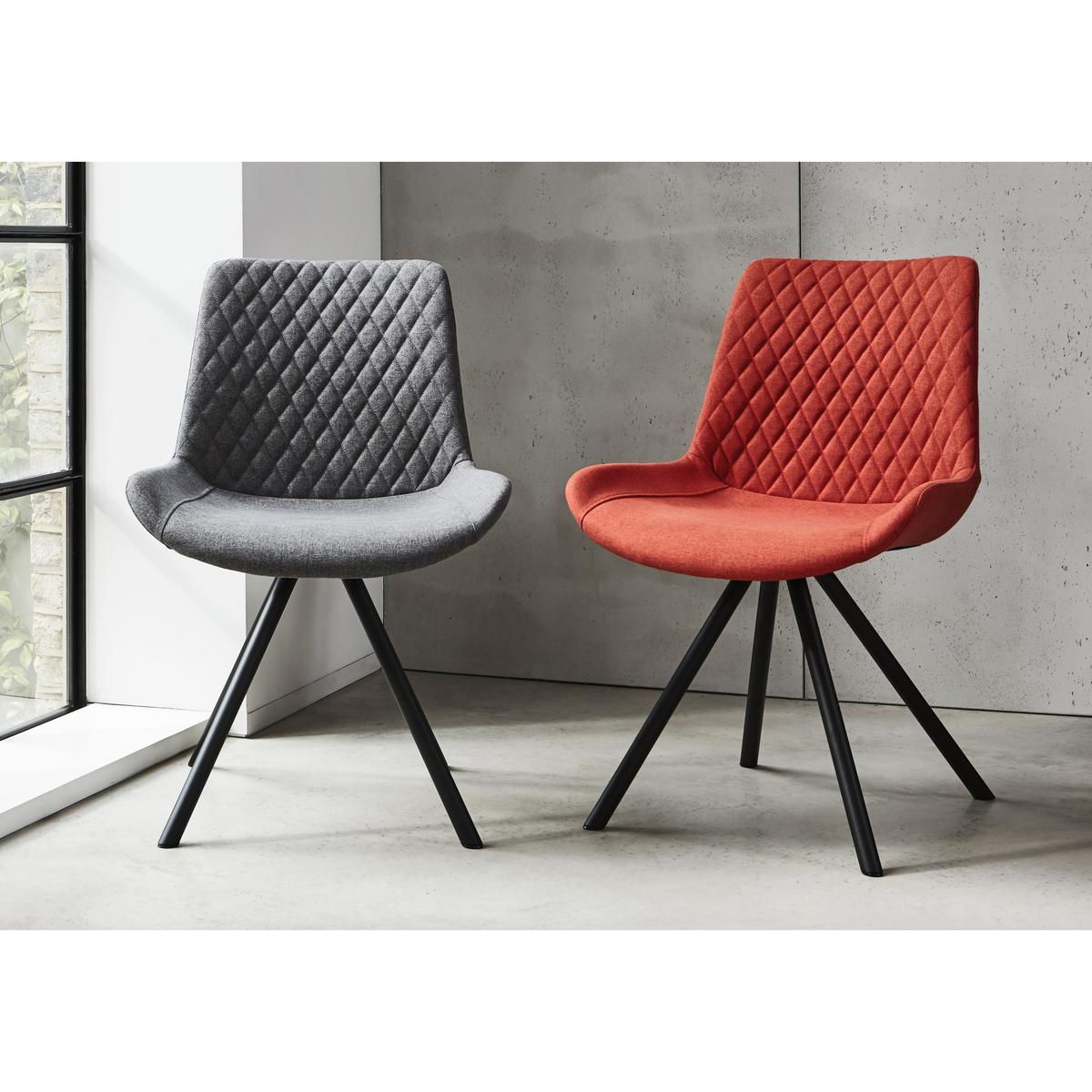 ●Contemporary retro- style dining chair with gently curved seat ●In fabric and faux leather in a choice of cool colours ●Slender splayed metal legs Style, comfort and incredible value what more could you want from a dining chair? The Rocket dining chair ticks all the boxes and offers a cool, retro vibe thats very on trend. Comfortably curved and with round supportive backs, this dining chair features plenty of padding so its the perfect choice whether youre sitting down for a meal or working at your dining table. Its beautifully upholstered and available in grey faux leather and high- quality fabric in a choice of sophisticated modern hues. Diamond- patterned quilted- effect stitching and decorative seams give this chair extra personality and make it perfect for even a formal dining room. Slender splayed metal pedestal- style legs complete the look. The Rocket dining chair is the perfect style partner for the Rocket dining table with its striking concrete- effect surface and powder- coated metal pedestal base. Youll also find this chair featured in a number of the dining sets that are part of the fantastic- value Rocket dining collection.