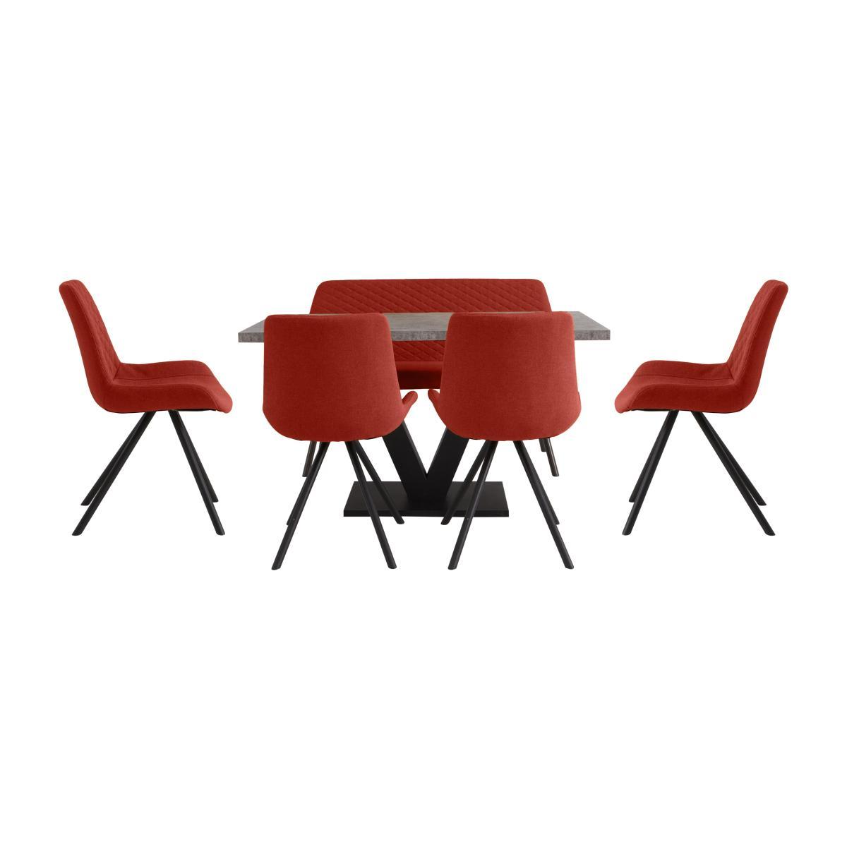 Bring cool retro style to your dining room or kitchen diner in the form of the Rocket range of dining chair and bar stool. Available in a choice of four modern colours, both the chair and the bar stool in this well-priced range have curved seats, supportive backs, quilted-effect upholstery and metal legs. The dining chair has pedestal-style splayed legs, while the bar stool features slender, gently tapered legs with a footrest at the front and sides. On trend style for contemporary homes. Cool and contemporary style at an incredible price. Concrete-effect top with dark grey powder-coated metal pedestal base. With 4 retro-look dining chairs and a high back dining bench. Bring home the great-value dining set that’s perfectly in tune with daily life. The Rocket dining table, four chairs and high back dining bench dining set is practical, hardwearing and stylish, and ideal for family mealtimes as well as more formal dining occasions. Your guests will love the cool grey concrete-effect table with its dramatic V-shaped pedestal base made of dark grey powder-coated metal. Sturdy and practical with a hardwearing heat-resistant finish, this table really is one for all seasons, whether you’re dining in style or working from home. This striking table is paired with two types of generously-cushioned seating – four dining chairs and a high back dining bench. Both chairs and the bench have a cool retro vibe with gentle curves, splayed dark grey metal legs and fabulous upholstery. Choose either grey faux leather or high-quality fabric in one of four on trend shades for both the chairs and the bench. The Rocket dining table, four chairs and high back dining bench is part of the incredible-value Rocket dining collection at Furniture Village. Choose from a range of dining sets featuring the Rocket dining table or create your own. Please note. The finish of each concrete-effect table top will display variations and unique markings. This should not be considered a fault. While hard-wearing, this finish is not completely heat resistant. Be sure to use coasters and placemats at all times.