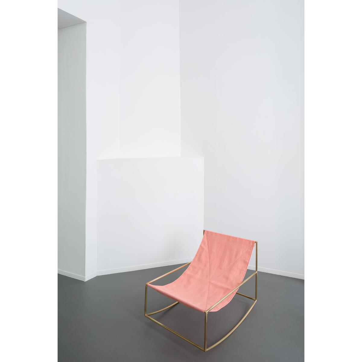 Known as Muller Van Severen, the Flemish design duo Fien Muller and Hannes Van Severen work at the intersection of art and design. They are among the most prominent creators of the moment. From galleries to museums, not to mention collectors, design enthusiasts and design houses, everyone loves their minimalist, colourful furniture, timeless and joyful. In less than a decade, Muller Van Severen has become a key player in design, to the point of winning numerous awards and increasing collaborations with prestigious museums (Pompidou Centre, Vitra museum, etc. ). It was in 2012 that the creative duo initiated this collection of seats. That year, they were chosen to mount an exhibition at the Kortrijk Interieur Biennale. As the space where the event was held had no seats, the designers decided to remedy this by creating a collection of seats with a simple basic concept: stretch a piece of cloth between two steel bars. This incredible rocking chair, inspired by the lounge chair, allows for gentle relaxation. This armchair is characterised by its graphic design: this piece of furniture that plays with transparency is imbued with great visual lightness. It oscillates in space without ever covering up the background. It doesn’t interrupt your space or impose with its presence, and can fit into any decor. A clever blend of sobriety and originality, it offers the maximum effect with a minimum of substance. This rocking chair consists of an extremely thin and airy steel structure on which a flexible, fluid canvas is suspended (in leather or linen), which seems to float. The rocking chair comes in pretty colour combinations. A true invitation to relax, the flexibility of the suspended canvas leaves plenty of room for comfort. You feel like you’re in a hammock! This armchair is ideal for setting up a relaxation area in a living room, office, reading room. Fien Muller and Hannes Van Severen, ex-sculptor and ex-photographer respectively, infuse each of their pieces with a touch of poetry. Hannes explains: “Design is linked to function. We come from the visual arts. So we’re just trying to create sculptural furniture to occupy space. Art or design, creation takes place the same way … and provides the same satisfaction. Poetry is possible even in the industrial”, concludes Fien.