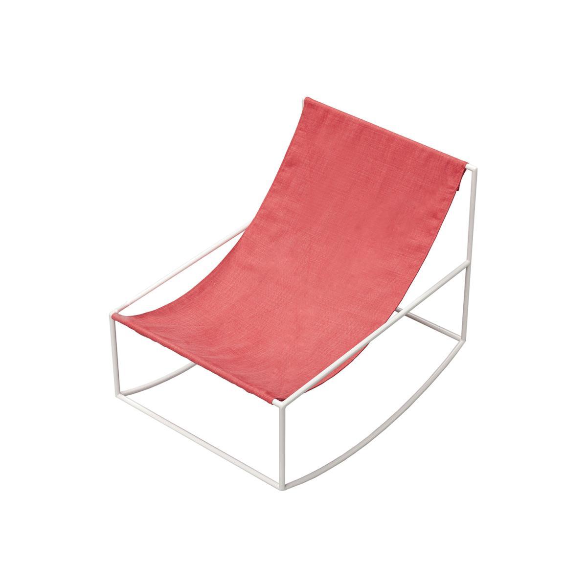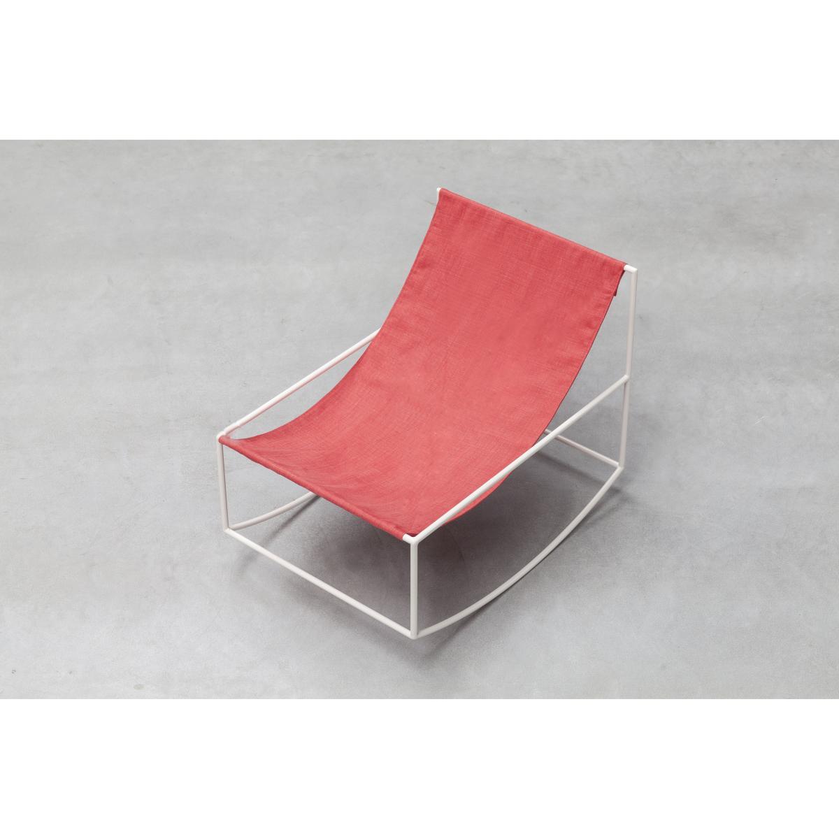 Known as Muller Van Severen, the Flemish design duo Fien Muller and Hannes Van Severen work at the intersection of art and design. They are among the most prominent creators of the moment. From galleries to museums, not to mention collectors, design enthusiasts and design houses, everyone loves their minimalist, colourful furniture, timeless and joyful. In less than a decade, Muller Van Severen has become a key player in design, to the point of winning numerous awards and increasing collaborations with prestigious museums (Pompidou Centre, Vitra museum, etc. ). It was in 2012 that the creative duo initiated this collection of seats. That year, they were chosen to mount an exhibition at the Kortrijk Interieur Biennale. As the space where the event was held had no seats, the designers decided to remedy this by creating a collection of seats with a simple basic concept: stretch a piece of cloth between two steel bars. This incredible rocking chair, inspired by the lounge chair, allows for gentle relaxation. This armchair is characterised by its graphic design: this piece of furniture that plays with transparency is imbued with great visual lightness. It oscillates in space without ever covering up the background. It doesn’t interrupt your space or impose with its presence, and can fit into any decor. A clever blend of sobriety and originality, it offers the maximum effect with a minimum of substance. This rocking chair consists of an extremely thin and airy steel structure on which a flexible, fluid canvas is suspended (in leather or linen), which seems to float. The rocking chair comes in pretty colour combinations. A true invitation to relax, the flexibility of the suspended canvas leaves plenty of room for comfort. You feel like you’re in a hammock! This rocking chair is ideal for setting up a relaxation area in a living room, office, reading room. Fien Muller and Hannes Van Severen, ex-sculptor and ex-photographer respectively, infuse each of their pieces with a touch of poetry. Hannes explains: “Design is linked to function. We come from the visual arts. So we’re just trying to create sculptural furniture to occupy space. Art or design, creation takes place the same way … and provides the same satisfaction. Poetry is possible even in the industrial”, concludes Fien.