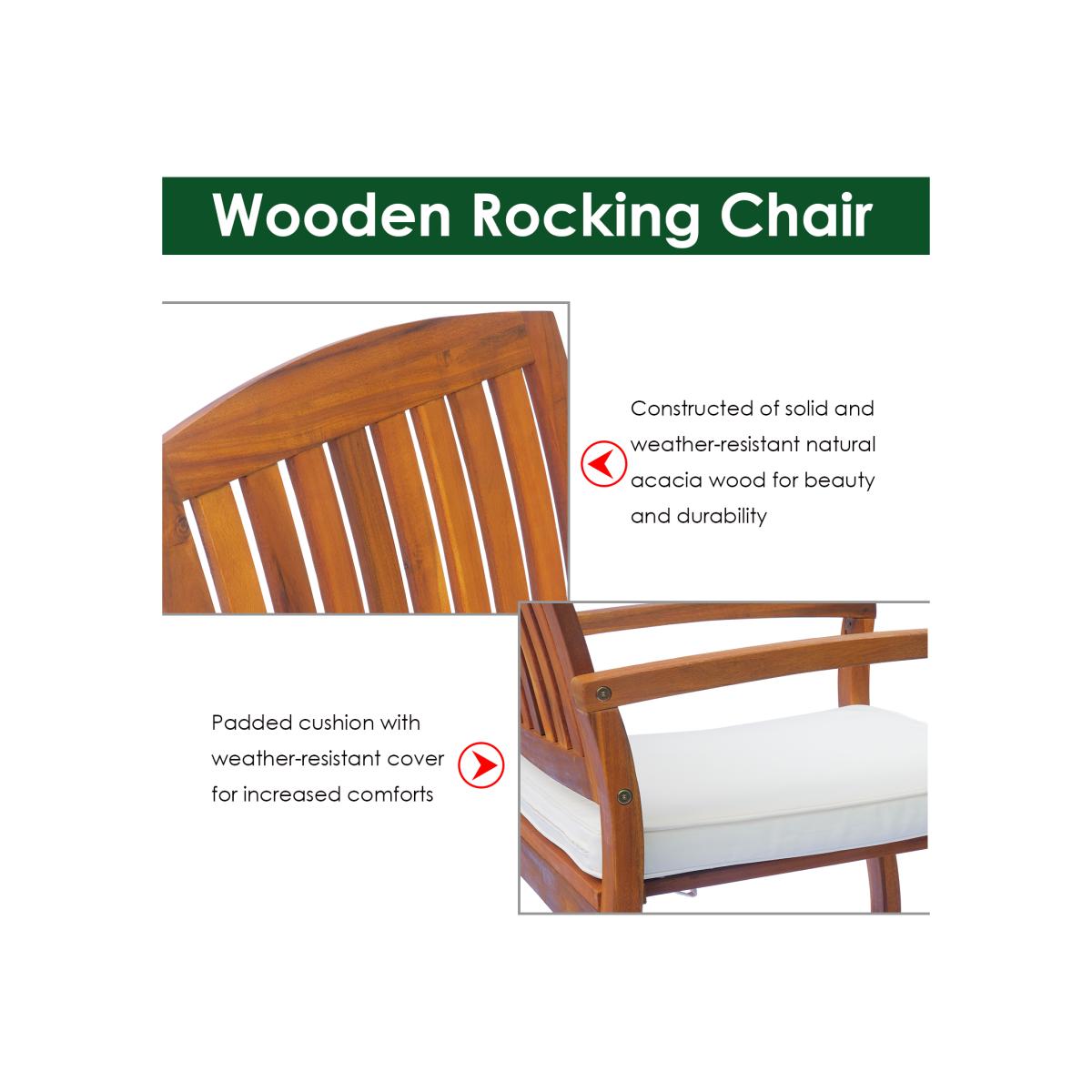 This Outsunny rocking chair is an ideal addition to your garden and patio. Made from high-quality durable acacia hardwood, it will match any indoor or outdoor. The chair comes complete with 5cm padded cushions for your comfort. Kick back, relax, and enjoy the smooth rocking glide while socializing or indulging yourself in your favourite book.