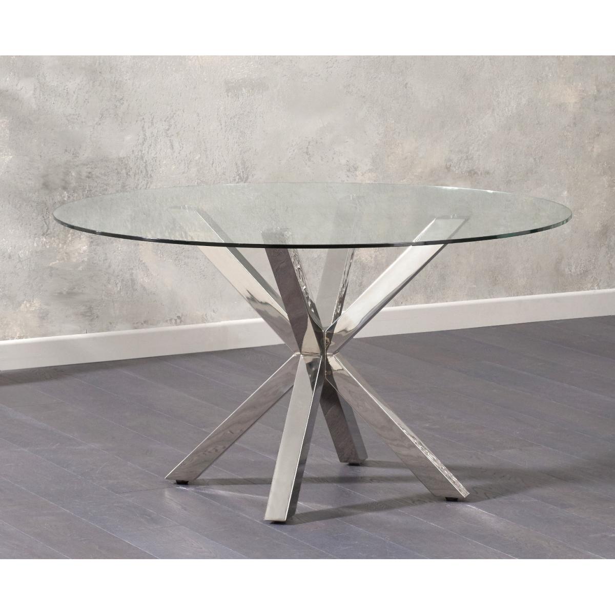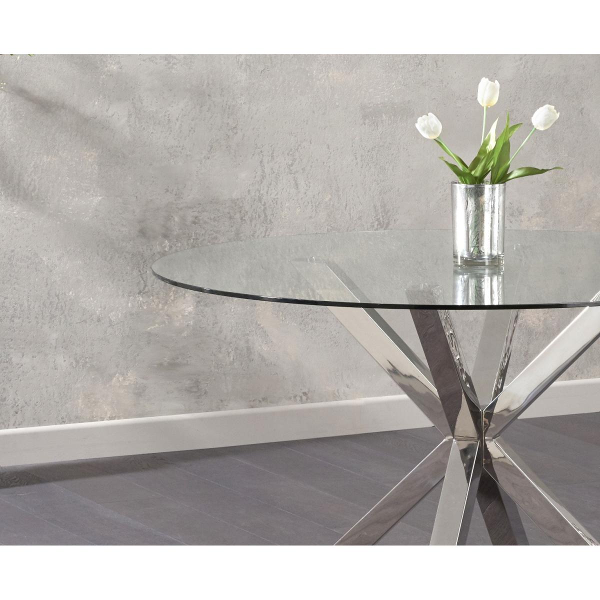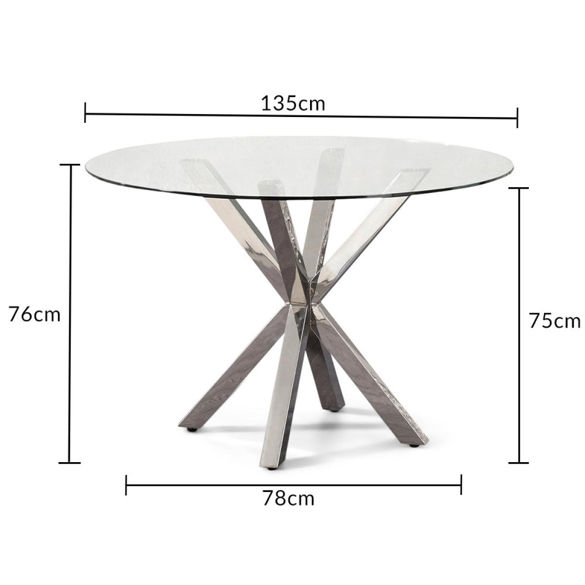 I’m a big fan of this round glass dining table for its clean lines and the way it keeps a space feeling light and open. It works particularly well in modern or Scandinavian-inspired interiors, where its reflective surface and sleek metal base can play off soft textures and muted colour palettes. To style it, layer a subtle woven rug underneath to define your dining area, mix in upholstered or leather chairs for contrast, and keep centrepieces minimal - think a simple vase of fresh foliage or a sculptural candle holder.