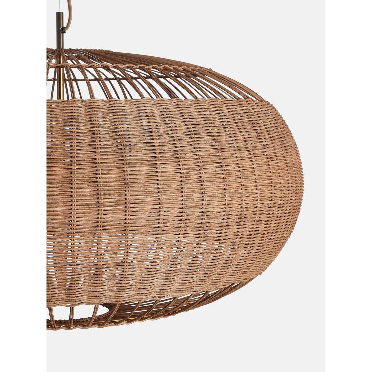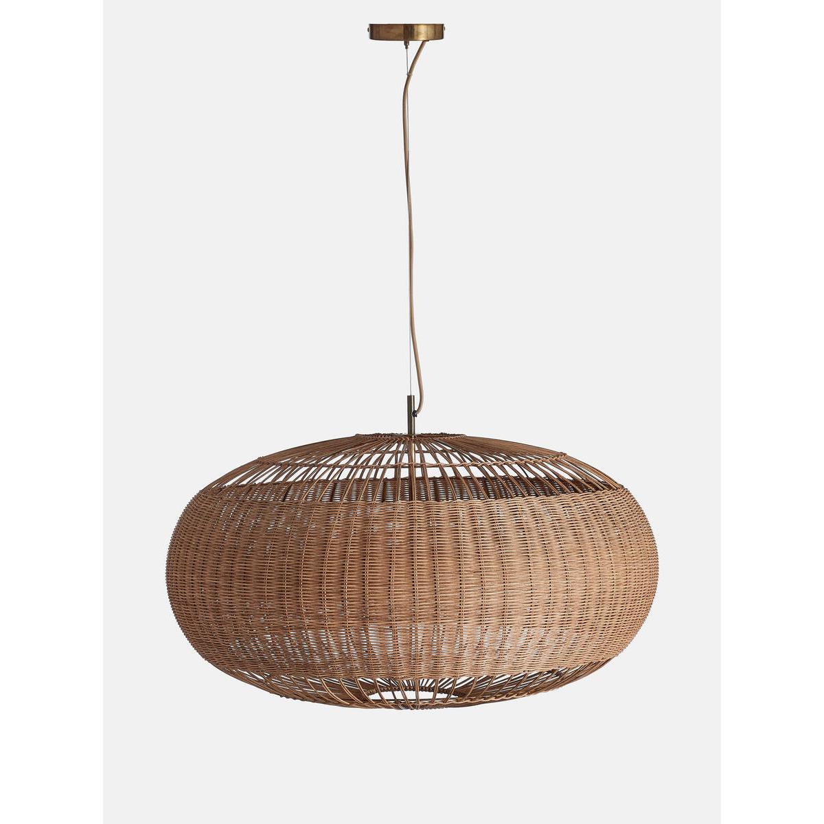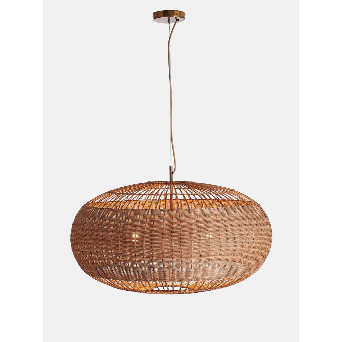 Inspired by the relaxed aesthetic of our new beach Housesincluding Soho Roc House on Mykonos and the soon to open Canouan,our Rohe pendant showcases the natural beauty of rattan. The largewoven shade sits on an antique brass finish, with three bulbscreating distinctive light patterns. Large multi bulb pendant light. Shade in woven rattan. Antique brass finish frame and detailing. Requires 3 / E27 / 60W Max. Inspired by Soho Roc House.