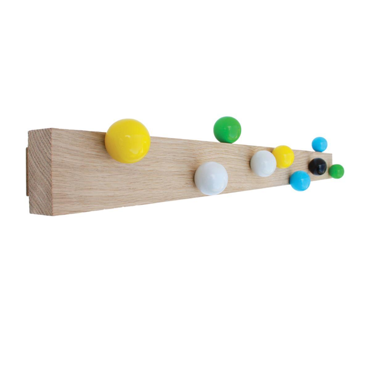 Both original and elegant, this wall-mounted coat rack will add a touch of colour to your home! Made by hand, it consists of a solid oak structure on which lacquered beech wood pegs are placed all over. In addition to dressing your walls, it’s perfect for hanging your coats, bags, scarves. You’ll love its airy structure and gay colours contrasting with the natural wood of the structure.
