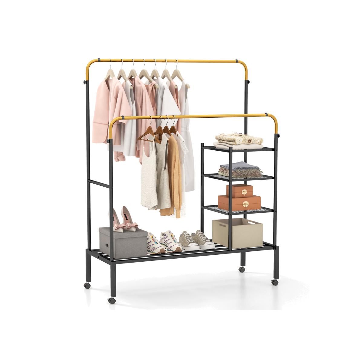 The clothes drying rack has 2 height adjustable hanging bars with individual adjustments, allowing it to hold clothes of various lengths. Moreover, the side and bottom shelves provide more storage options. Made of solid carbon steel, this garment rack is durable and sturdy. Equipped with 360-degree swivel wheels, the clothing rack can be easily moved around.