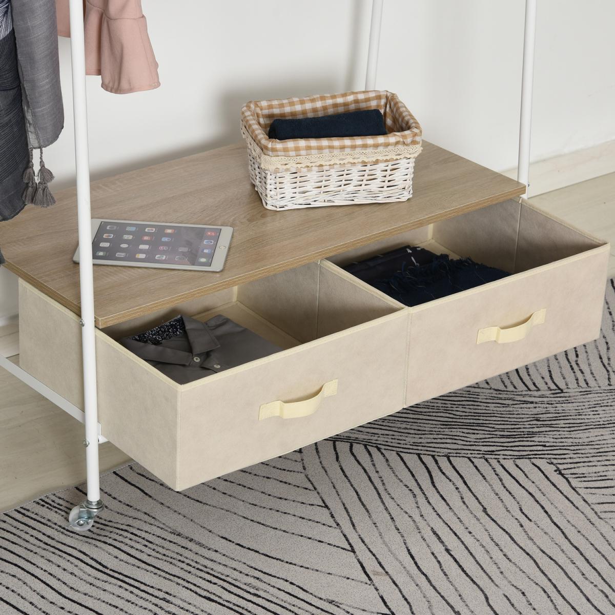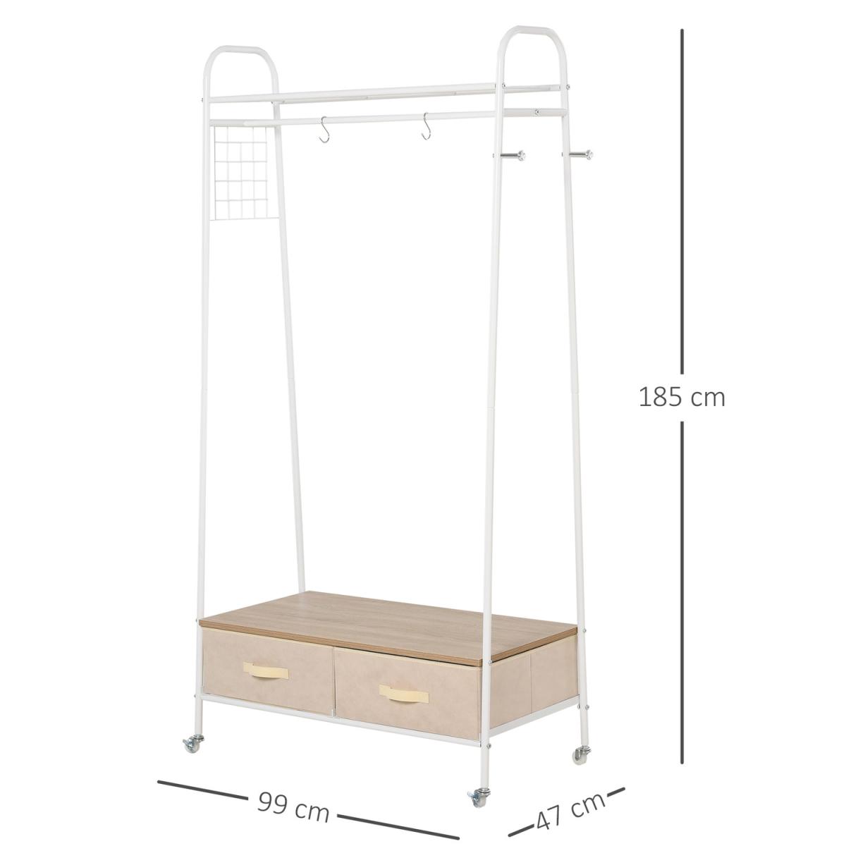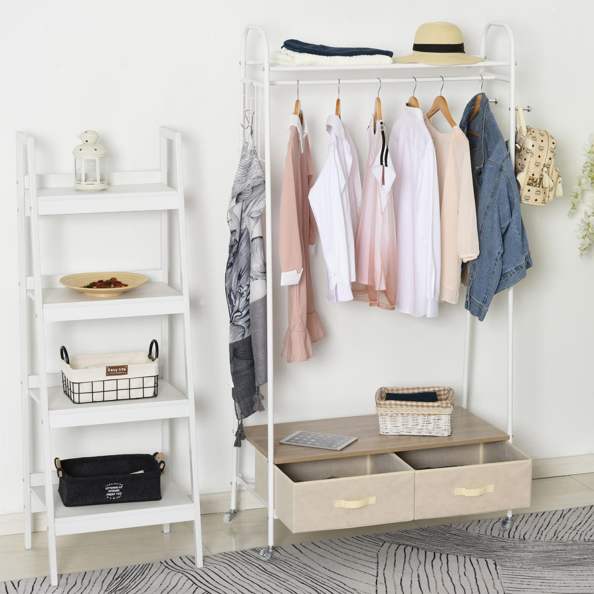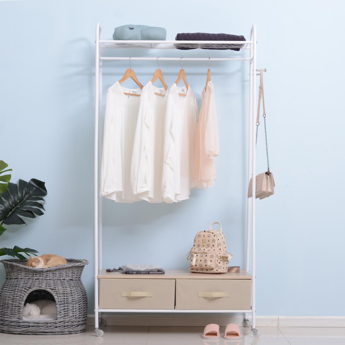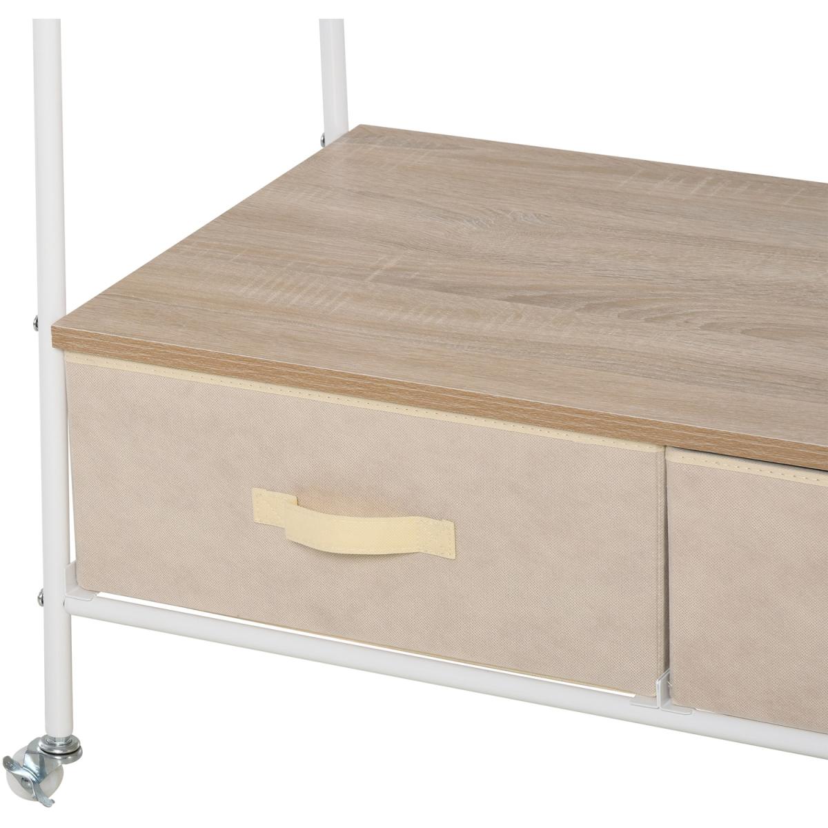 Rolling Coat Rack & Storage Shelf With 2 Drawers - White with Beige