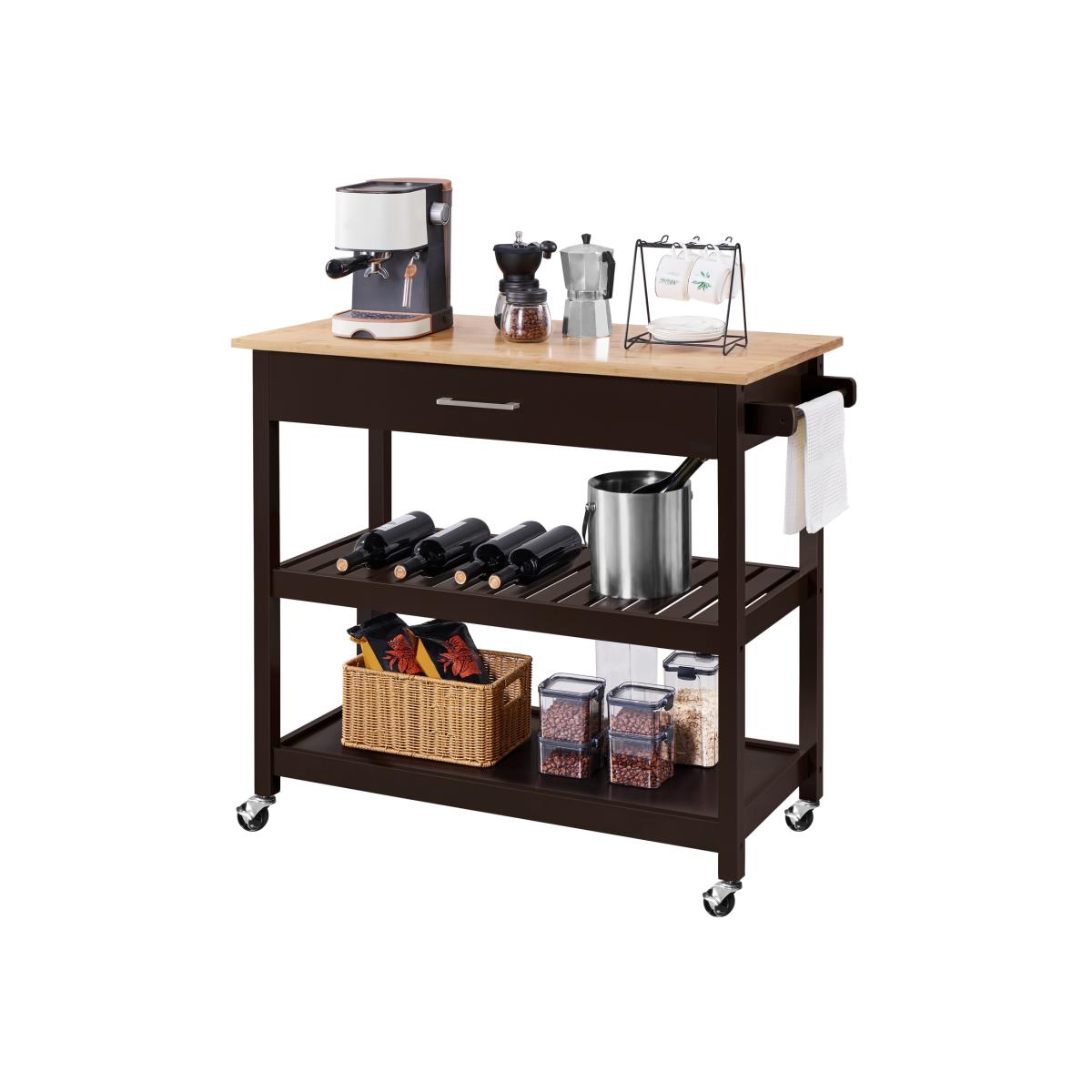 Crafted from a blend of solid and manufactured wood, this kitchen cart boasts a neutral solid hue that wont easily clash with your current home dcor. The generously sized countertop is completed with a widened drawer and two open shelves to keep your kitchenware essentials corralled. Moreover, the four wheels are easy to maneuver and lock into place to prevent rolling.