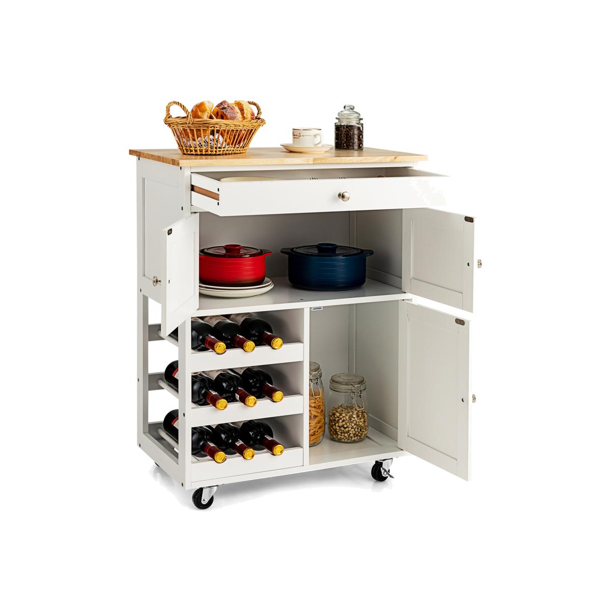 Our kitchen cart can keep your kitchen space organized and tidy! The combination of MDF material and rubber wood top makes this kitchen island cart ultra durable and stable, which avoids breaking and deformation. It has versatile storage space, and you can place your kitchen essentials in drawer, racks and door cabinets. Besides, you can easily move the cart with four smooth wheels. The wheels are made of rubber, which reduces noise while moving and protects the floor from scratches. Owing to its waterproof surface, the cart is easy to clean and maintain. Just take one home and keep the kitchen in great order.
