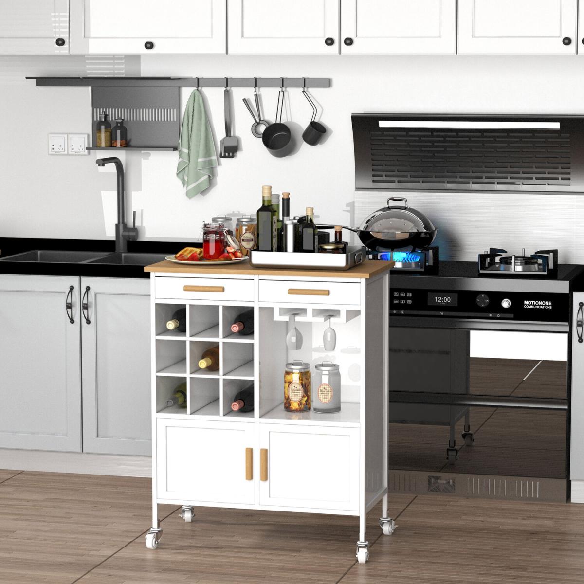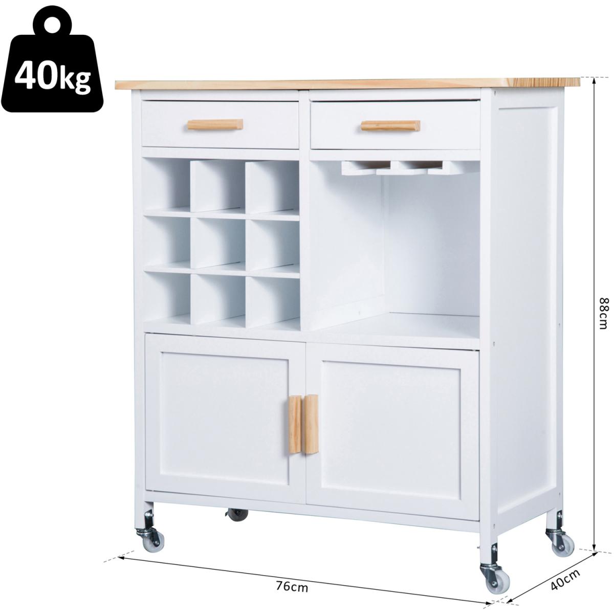This HOMCOM kitchen trolley is a great unit to have, use it as an additional workplace, or just use it as a mobile storage solution for your wine bottles and glasses. It also comes with two drawers and a storage cupboard at the bottom, these are great places to keep your kitchen essentials. The trolley also sits on casters to make it mobile to place wherever you wish. This is a great item and will fit in any kitchen decor.