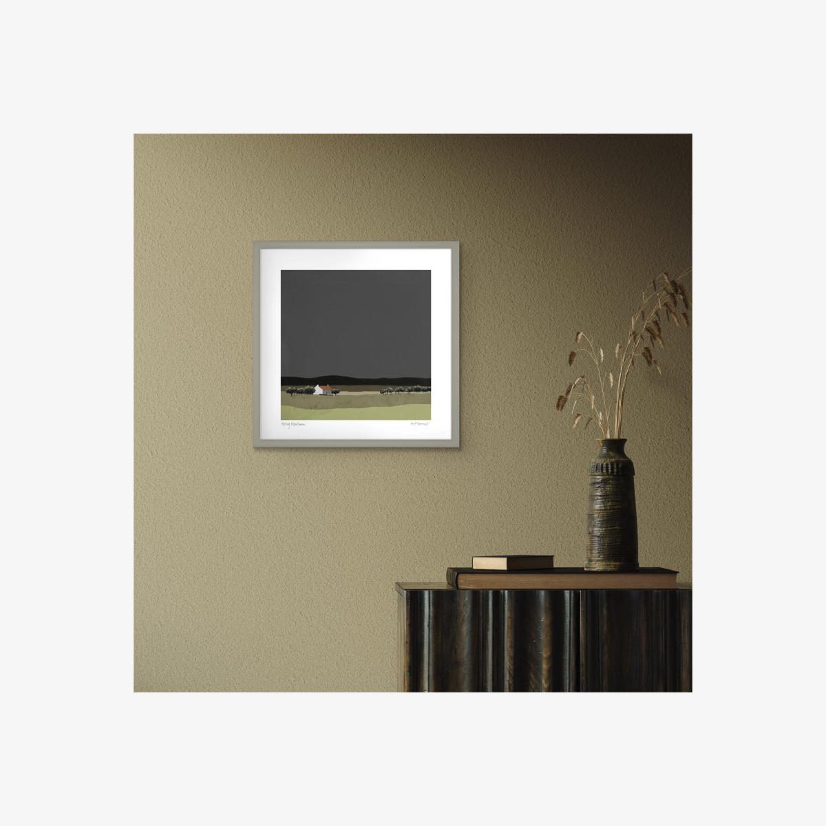 I really like the Rolling Moss Farm print for its understated, calming colour palette and simple landscape subject. It works particularly well in minimalist or contemporary interiors, where its subtle tones can add a touch of nature-inspired tranquillity without overpowering the space. For styling, consider pairing it with clean-lined furniture and neutral textiles to keep the focus on the artwork. It also looks great placed above a sideboard or console table, as a focal point that ties the room together. To enhance its visual impact, try framing it with a slightly thicker, matte frame which will add a bit of presence without competing with the serenity of the print.