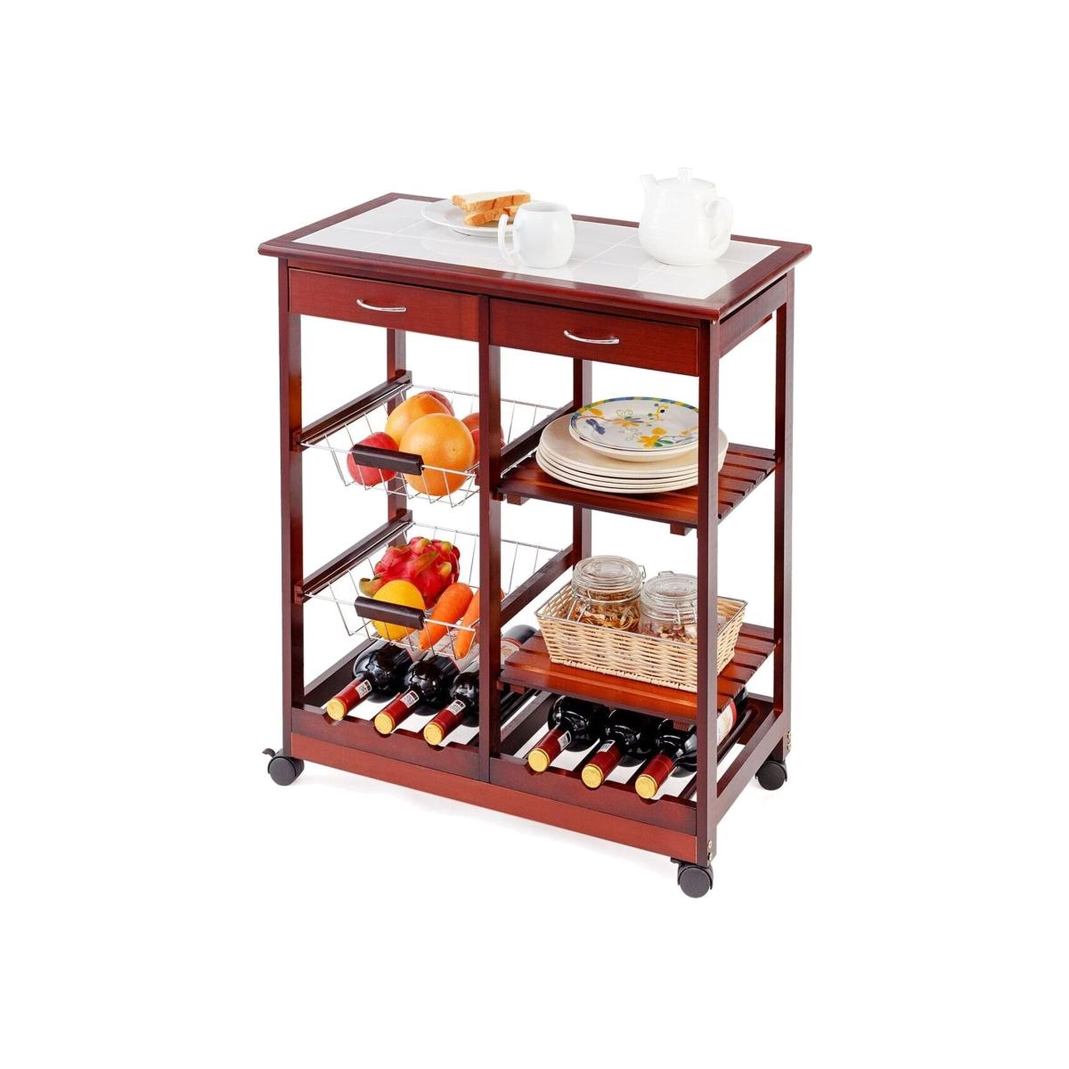 Such a versatile kitchen cart will surely make your home more tidy! Selected tile countertops shall provide longer service time due to their excellent durability while offering extra storage space. There are 2 drawers, 2 wire baskets, 2 slatted shelves and 2 wine racks aimed at providing large enough space for all sorts of kitchen supplies, to help you keep a neat kitchen environment. In addition, a solid wood frame provides ultra-reliable support for years to come.