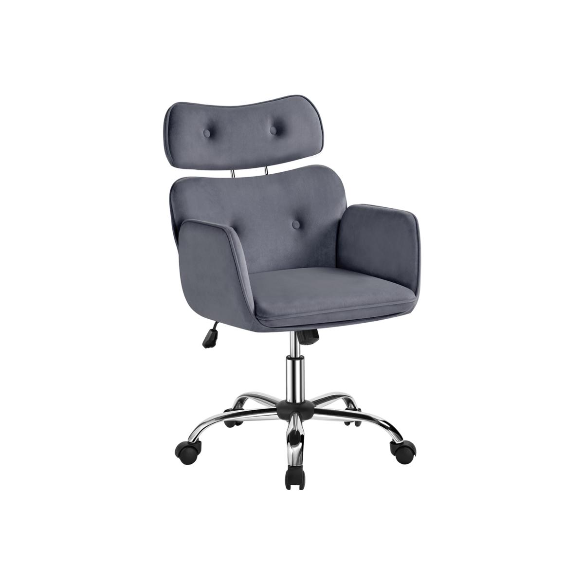 Refresh your workspace or living area with this modern home office chair, featuring a sturdy silver-plated metal base and soft velvet fabric over high-density foam for exceptional comfort and durability. The foam-filled seat, along with the gently curved backrest and adjustable headrest, ensures personalized comfort and support. Effortlessly adjust the seat height and tilt tension to suit your needs, while the 360 swivel nylon casters provide smooth, quiet mobility. Sporting a curved backrest with button tufting, luxe velvet upholstery on a shiny star base, and elegantly flared arms, this vanity chair adds sophistication and luxury to any space.
