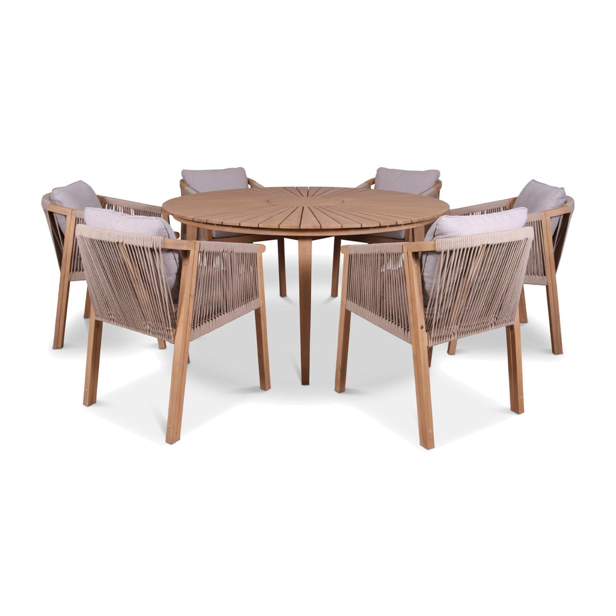 Introducing Roma 7 Piece Round Dining Set crafted from beautiful Certified Acacia hardwood. This practical and durable set is coated with a PU coating, ensuring long-lasting quality. The set comprises of a 150cm Table featuring a stunning sunray design and 6 Roma Chairs wrapped with a beautiful synthetic rope to elevate the contemporary design feature. This set showcases the natural beauty of Acacia hardwood. Its natural tones and exquisite craftsmanship make it the perfect choice for creating high quality furniture.