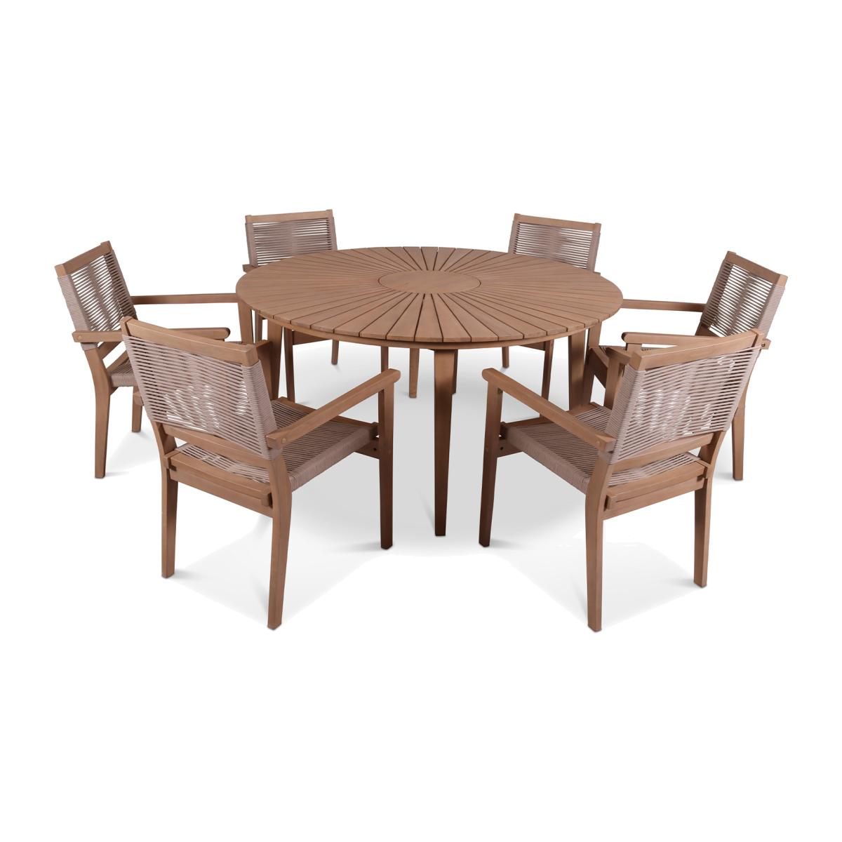 Introducing Roma 7 Piece Round Dining Set crafted from beautiful Certified Acacia hardwood. This practical and durable set is coated with a PU coating, ensuring long-lasting quality. The set comprises of a 150cm Table featuring a stunning sunray design and 6 Roma Chairs wrapped with a beautiful synthetic rope to elevate the contemporary design feature. This set showcases the natural beauty of Acacia hardwood. Its natural tones and exquisite craftsmanship make it the perfect choice for creating high quality furniture.