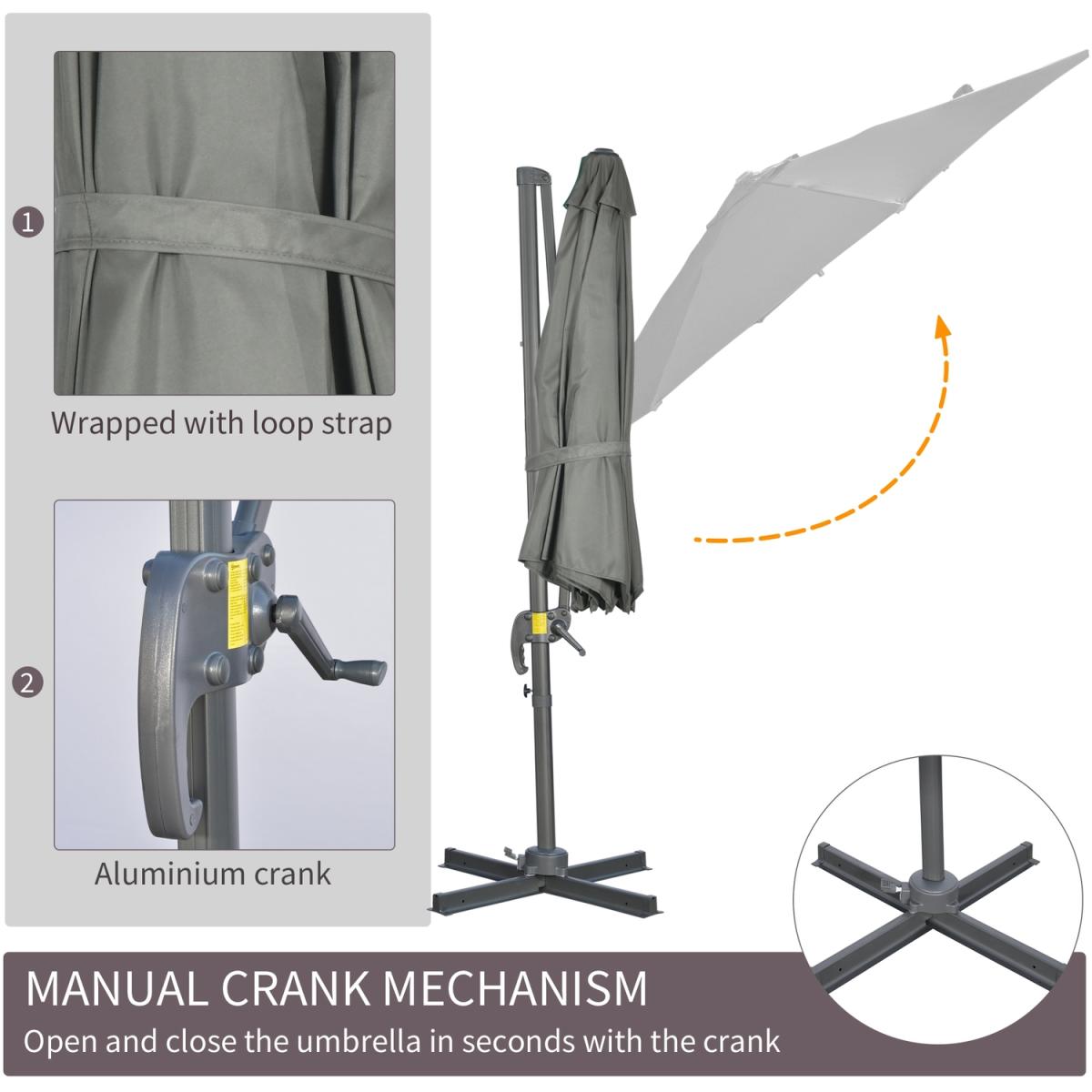 Keep yourself protected whilst enjoying the sun go for this Outsunny cantilever parasol. An aluminium frame means a strong core, with eight metal ribs connecting to the canopy for extra support. The canopy can be set to four different angles, it move a full 360 sideways - pick the shade position you want. Crank handle to open and close easily. Comes complete with a cross base (weights are required).