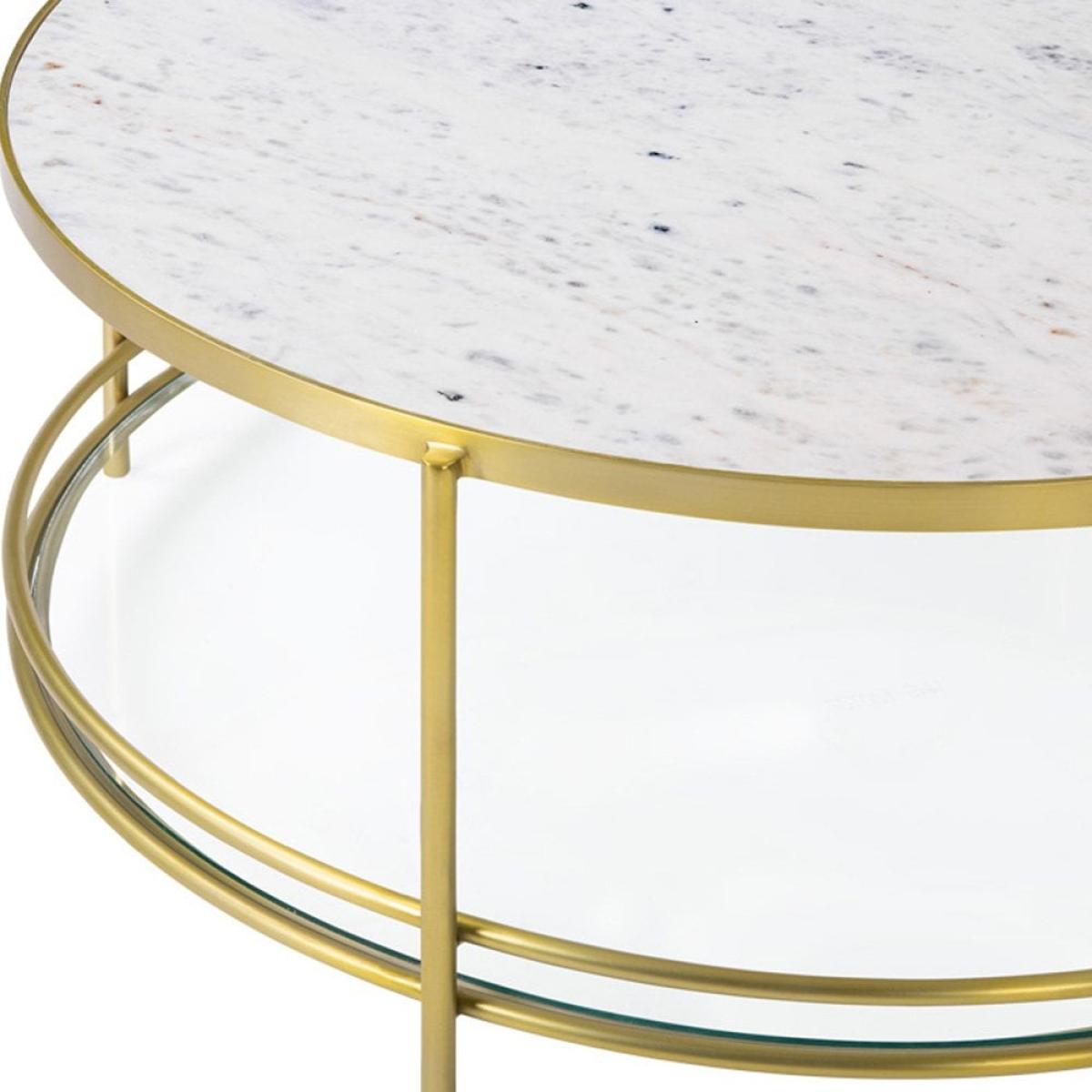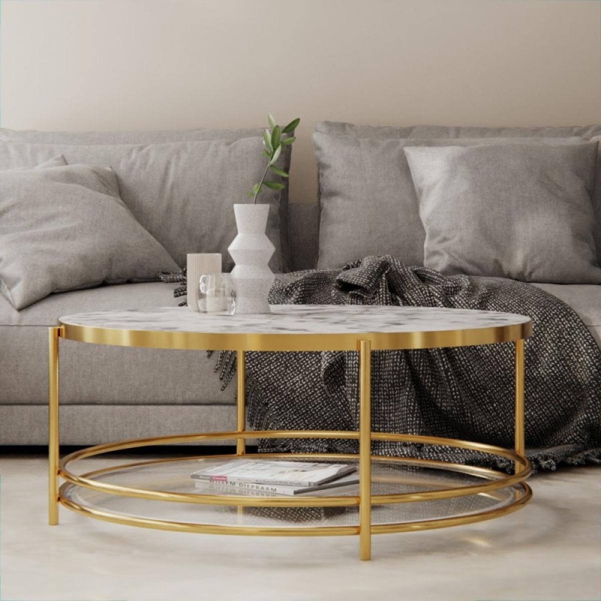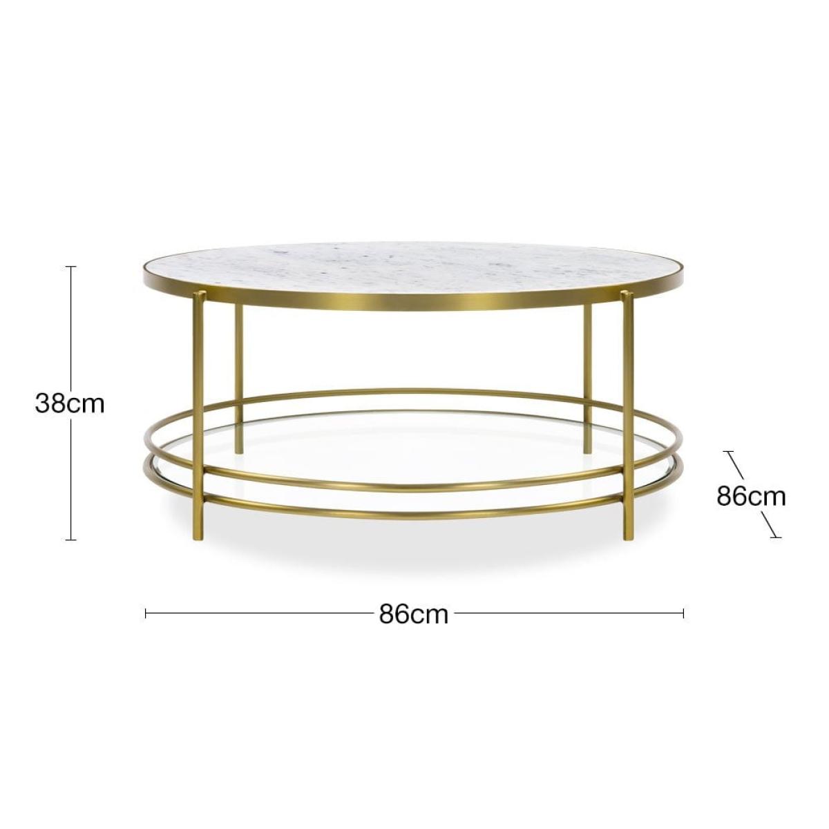 Add a luxe feel in your living area aesthetic with the Roma coffee table. With a round white marble top, metal frame and a glass shelf, the Roma offers a practical and stylish solution, perfect for living rooms. Note the Art Deco inspired design accents of this range. View The Roma Range This product is handcrafted, making each piece unique with naturally occurring texture, pattern, and colour. The natural materials used makes this product special and unique to you.