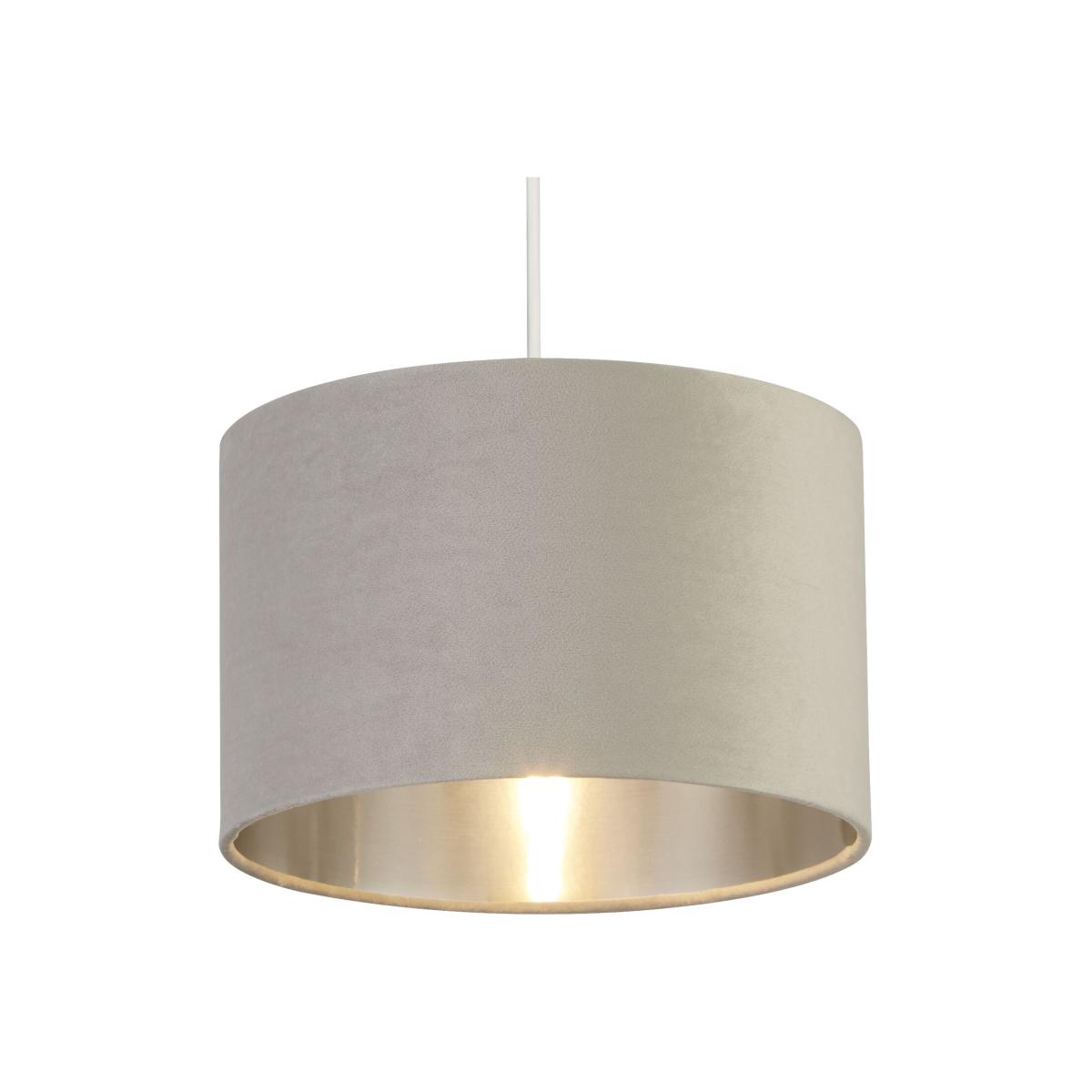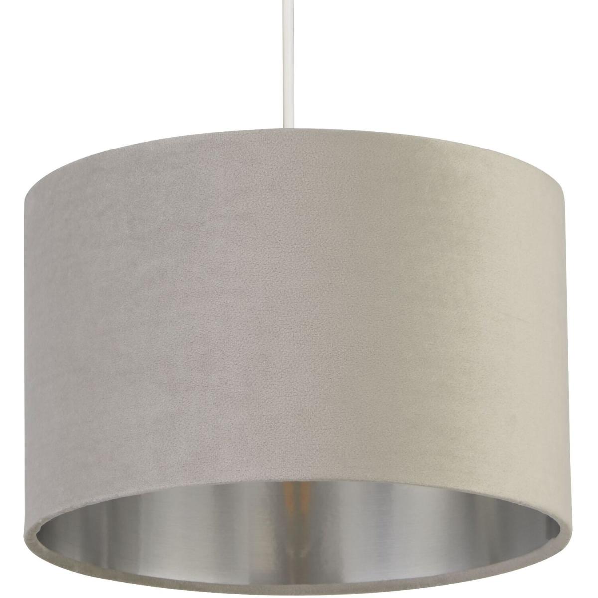 This sophisticated light grey velvet 27cm shade with metallic silver inner is designed to suit a range of interior decor styles. Suitable as a celling or on a lamp base due too its reversible gimble, this shade will elevate any room.