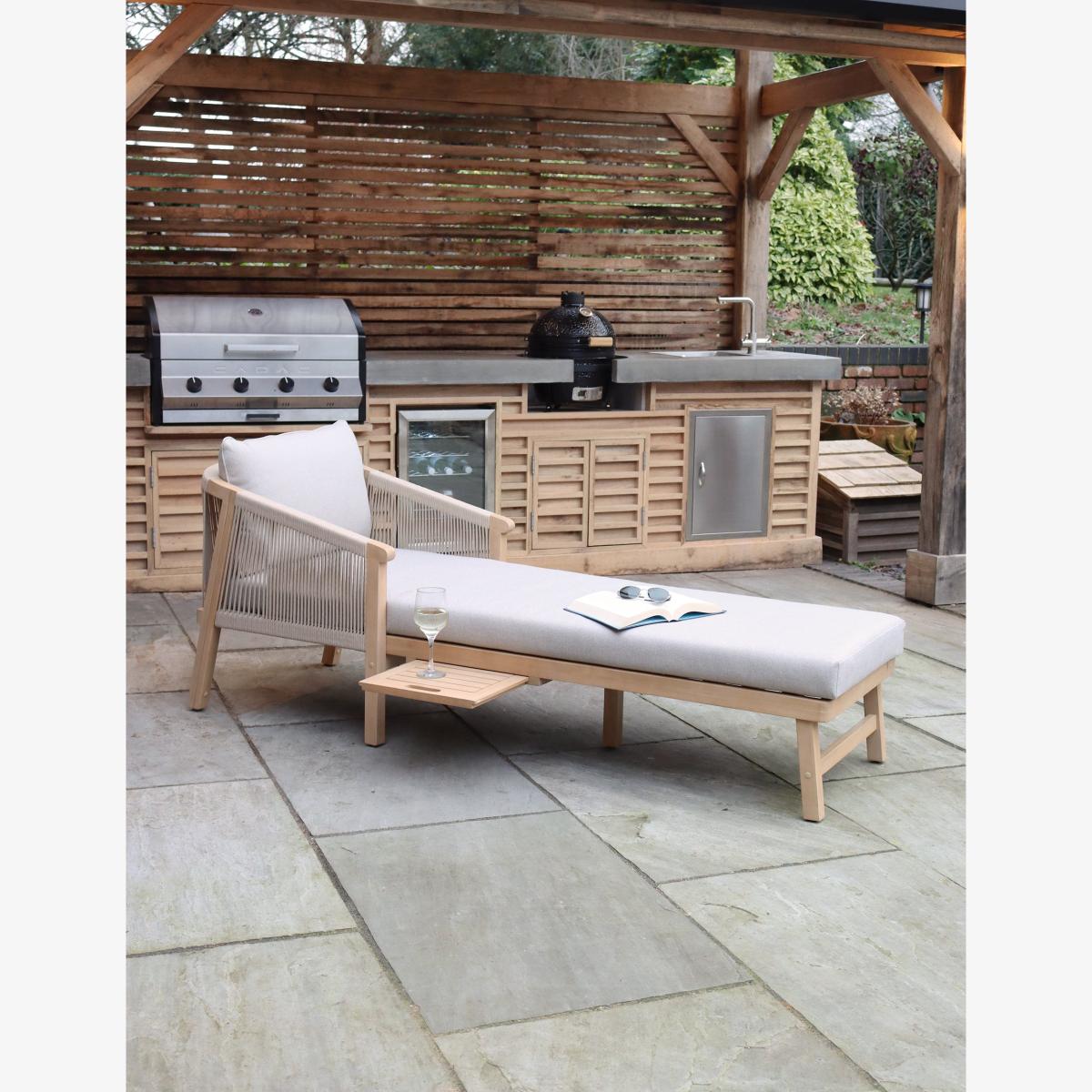 The Roma Rope Sun Lounger is crafted from beautiful sustainably sourced Acacia hardwood. This practical and durable sun lounger is coated with a PU coating, ensuring long-lasting quality. The sun lounger has a sliding side table to hold your books, drinks and snacks and is wrapped with a beautiful synthetic rope weave to elevate the contemporary design feature. Included with each seat is a luxurious seat and back cushion to embody comfort. This sun lounger showcases the natural beauty of sustainably sourced Acacia hardwood. It's natural tones and exquisite craftsmanship make it the perfect choice for creating high quality furniture.. Roma Collection. The Roma range represents a stylish fusion of wood and rope weave furniture, offering a sophisticated addition to any outdoor space.. Crafted from FSC 100% certified Acacia hardwood and finished with a PU coated light teak look, our furniture offers the perfect blend of sustainability, durability, and timeless elegance. With its responsibly sourced materials, you can enjoy peace of mind knowing that your outdoor furniture contributes to forest conservation and supports local communities.. The 6mm beige polyester round rope weave offers a sleek and modern aesthetic while also providing durability to withstand outdoor elements.. Olefin 250gr fabric cushions provide luxurious comfort for extended periods of outdoor relaxation. Olefin fabric is known for its resistance to fading, moisture, and stains, making it an excellent choice for outdoor use.. Features:. Material: FSC 100% Acacia wood with a PU finish. 6mm rattan round rope weave. Main colour: Beige. 2x cushions. Cushion colour: Light Grey. Pull out side table. Easy maintenance. Compliments any outdoor patio or decking space. Includes:. 1x Sun lounger with pull out side table. There may be a variance in size due to the nature of the material.. Please note: Colours may vary slightly from those shown. Variations can occur due to the natural characteristics of materials (such as wood, fabric, or rattan), as well as differences in screen resolution and lighting when viewing images.