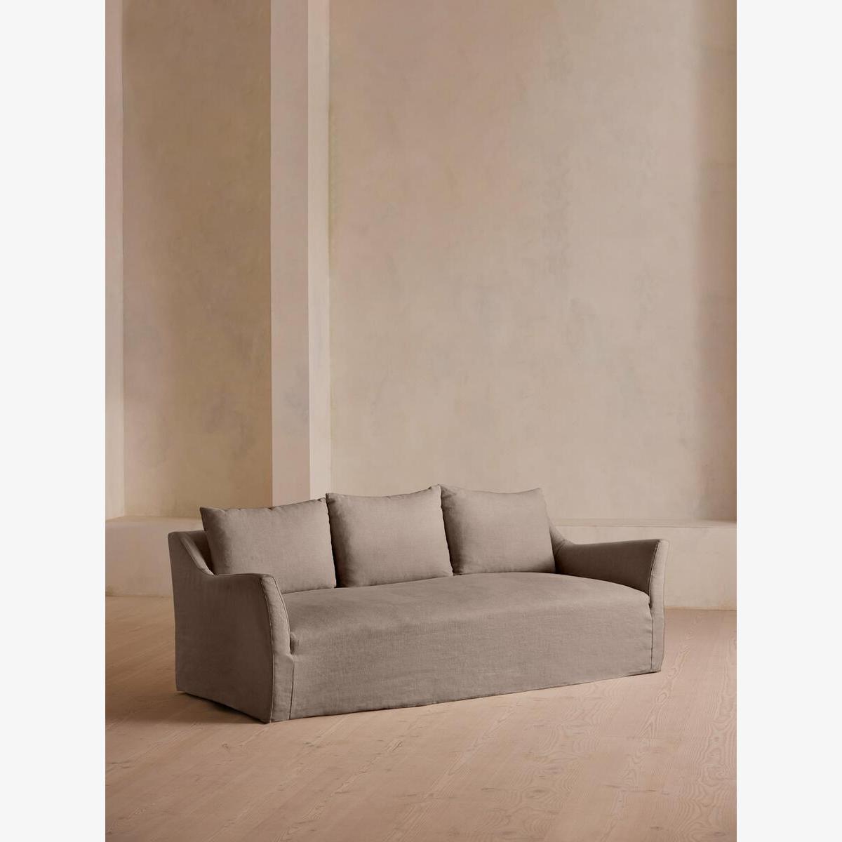Taking its cues from the open-plan barn spaces at Soho Farmhouse, our Roma sofa features a wide seat and flared arms - great for relaxed lounging and socialising with friends. Designed with a tailored linen slip cover, partner with the Roma loveseat and ottoman to recreate our cosy, country house look. Three-seater sofa Tailored slip cover in 100% linen Available in a range of colours Deep seat Flared arms Pair with other pieces from our Roma range Inspired by Soho Farmhouse