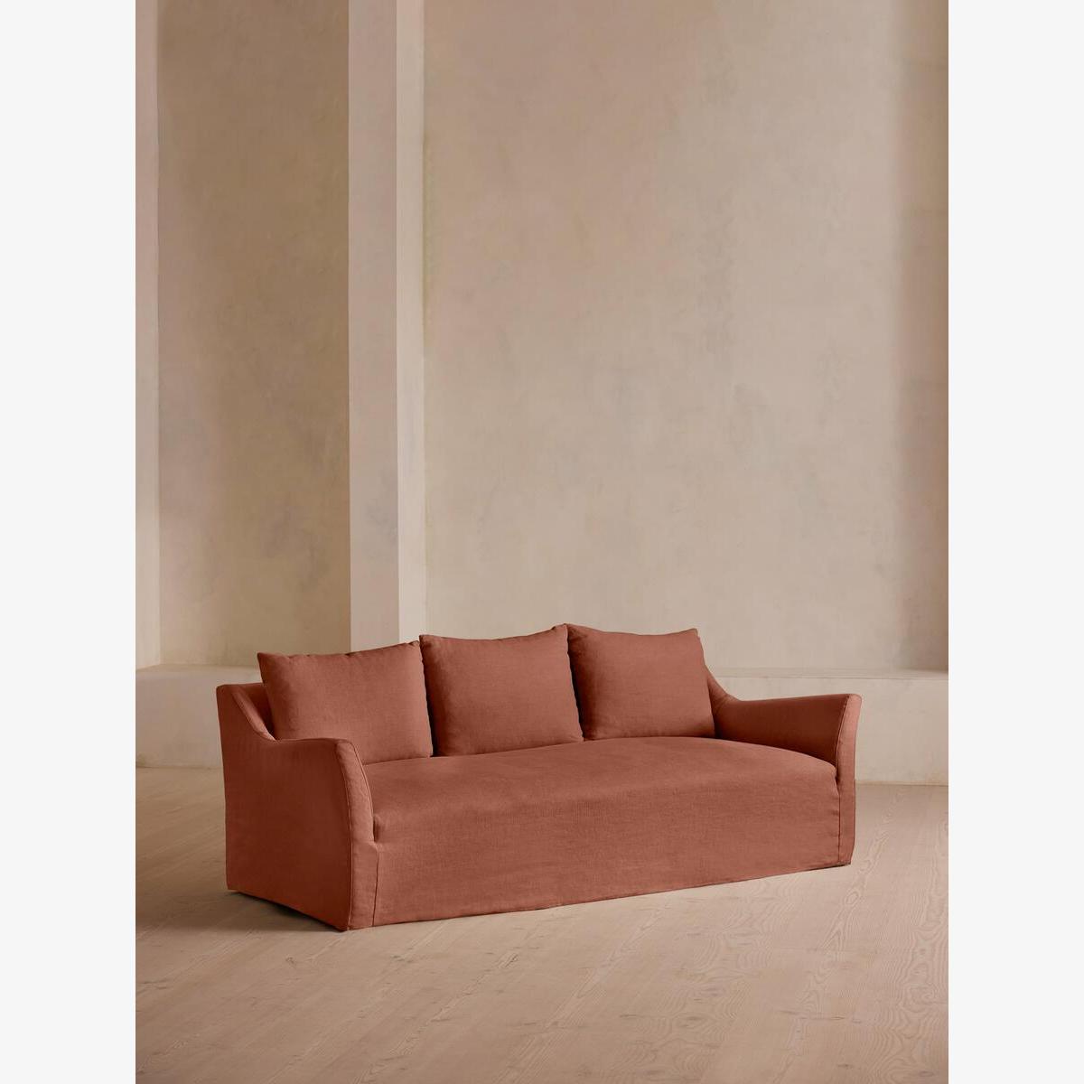 Taking its cues from the open-plan barn spaces at Soho Farmhouse, our Roma sofa features a wide seat and flared arms - great for relaxed lounging and socialising with friends. Designed with a tailored linen slip cover, partner with the Roma loveseat and ottoman to recreate our cosy, country house look. Three-seater sofa Tailored slip cover in 100% linen Available in a range of colours Deep seat Flared arms Pair with other pieces from our Roma range Inspired by Soho Farmhouse