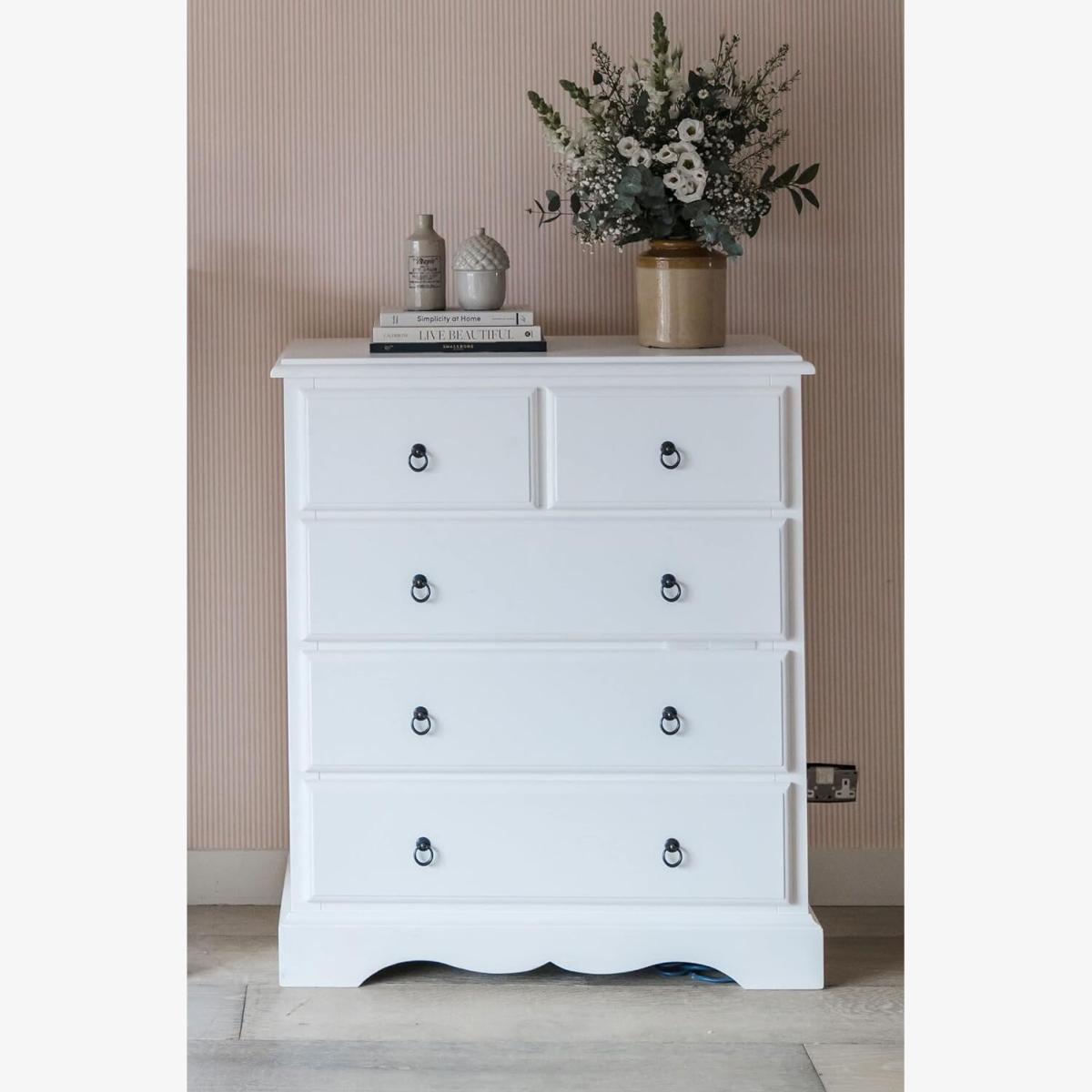 This elegant 2 over 3 large chest of drawers will beautifully furnish any bedroom. Available in a crisp True White or Antique White finish, it has a classic French country style that never goes out of fashion. Deep drawers provide plenty of storage space for folded clothes and linens. Choose between understated metal loop handles or glamorous diamond shaped crystal handles to add the perfect finishing touch. Solidly constructed from durable wood, this fully assembled chest of drawers arrives ready for use requiring no assembly. Its spacious yet tidy design allows you to stay organized while admiring its timeless appeal. Either colour option is sure to complement a variety of decor styles for years to come.