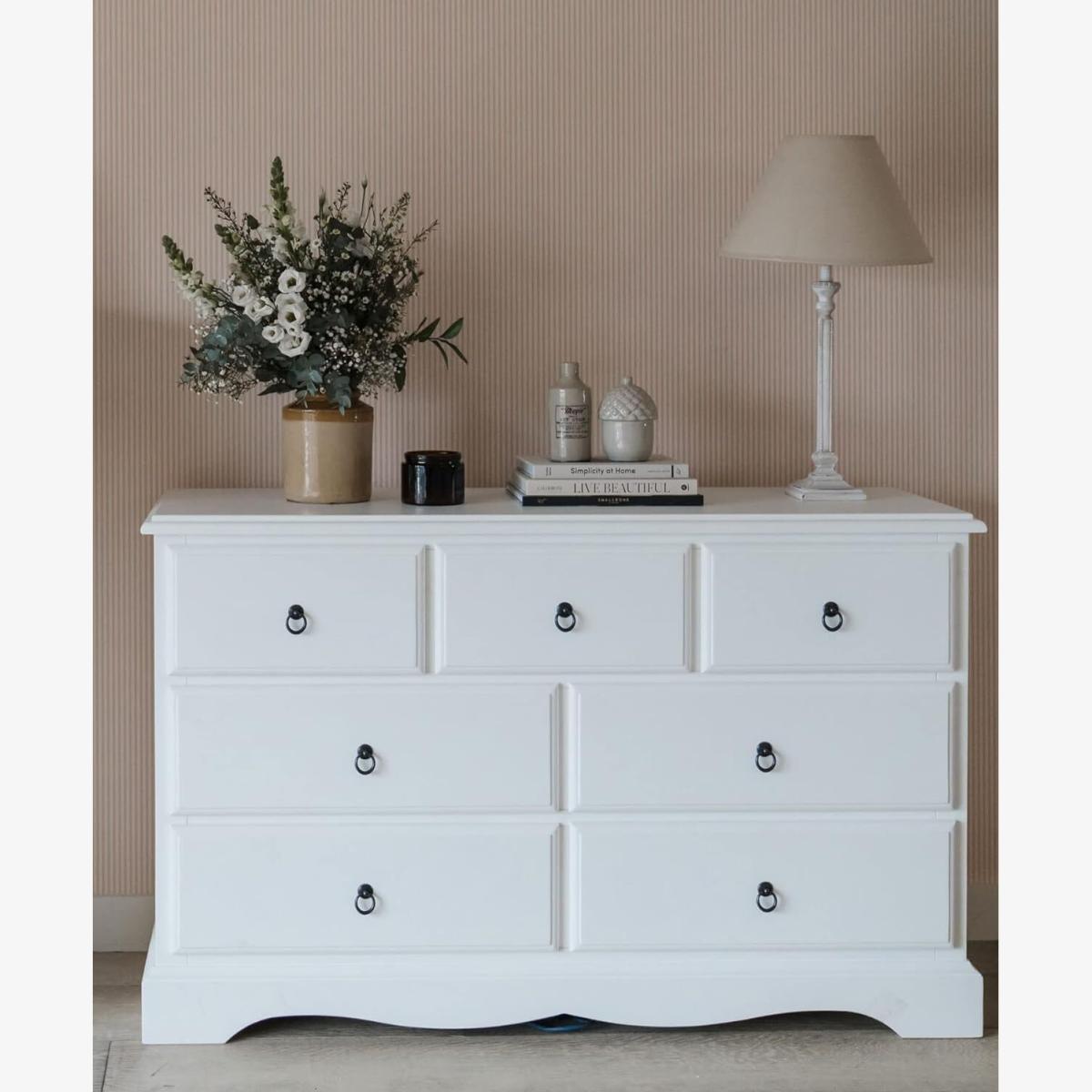 This elegant Romance 3 over 4 Chest of Drawers will furnish any bedroom or living space beautifully. Crafted from solid wood with a smooth antique or true white finish, it features seven spacious drawers for ample storage. Choose between understated metal loop handles or glamorous diamond-shaped crystal handles to easily pull open the drawers. Well made and sturdy, this fully assembled 7 drawer chest will stand the test of time. Its classic design is versatile enough to complement any style of home decor. Store everything from linens to clothing to accessories in this high quality chest.