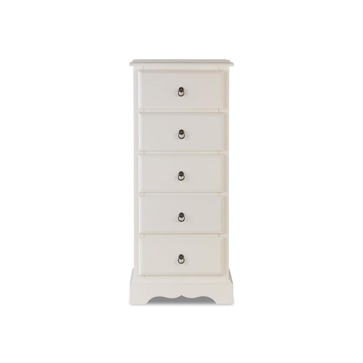 This Romance tallboy chest of drawers provides ample storage space in a narrow footprint. At 50cm wide, it fits easily against a wall while offering 5 generously sized drawers for all your folded items. Standing 119cm tall, each drawer is perfectly positioned for easy access without stooping. Crafted from high quality materials in a classic Antique White or crisp True White finish, this tallboy is built to last for years of use. Choose from traditional loop handles or elegant crystal accents to complement any style. Measuring just 42cm deep, it saves space without compromising on functionality. A practical and versatile addition for any bedroom or living area.
