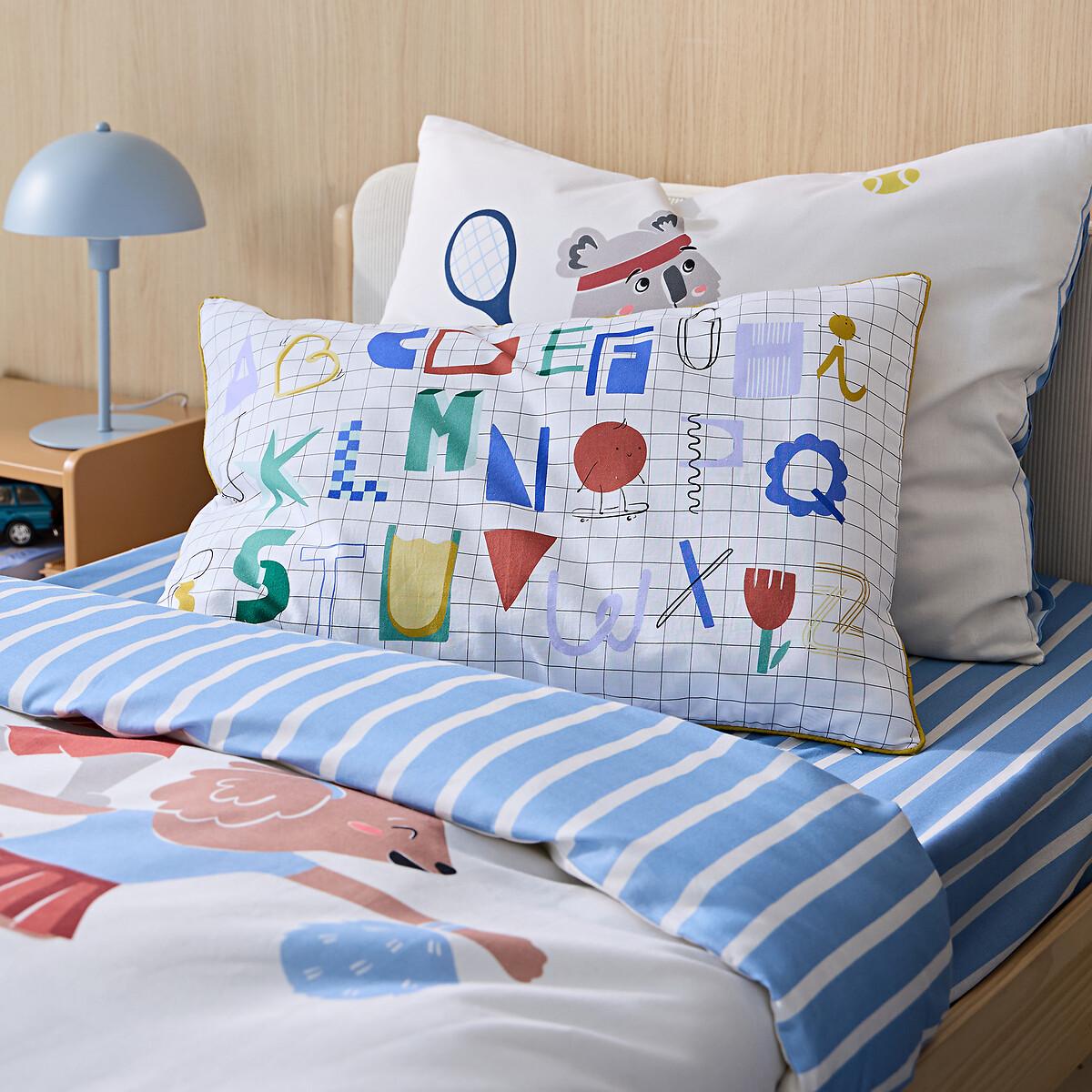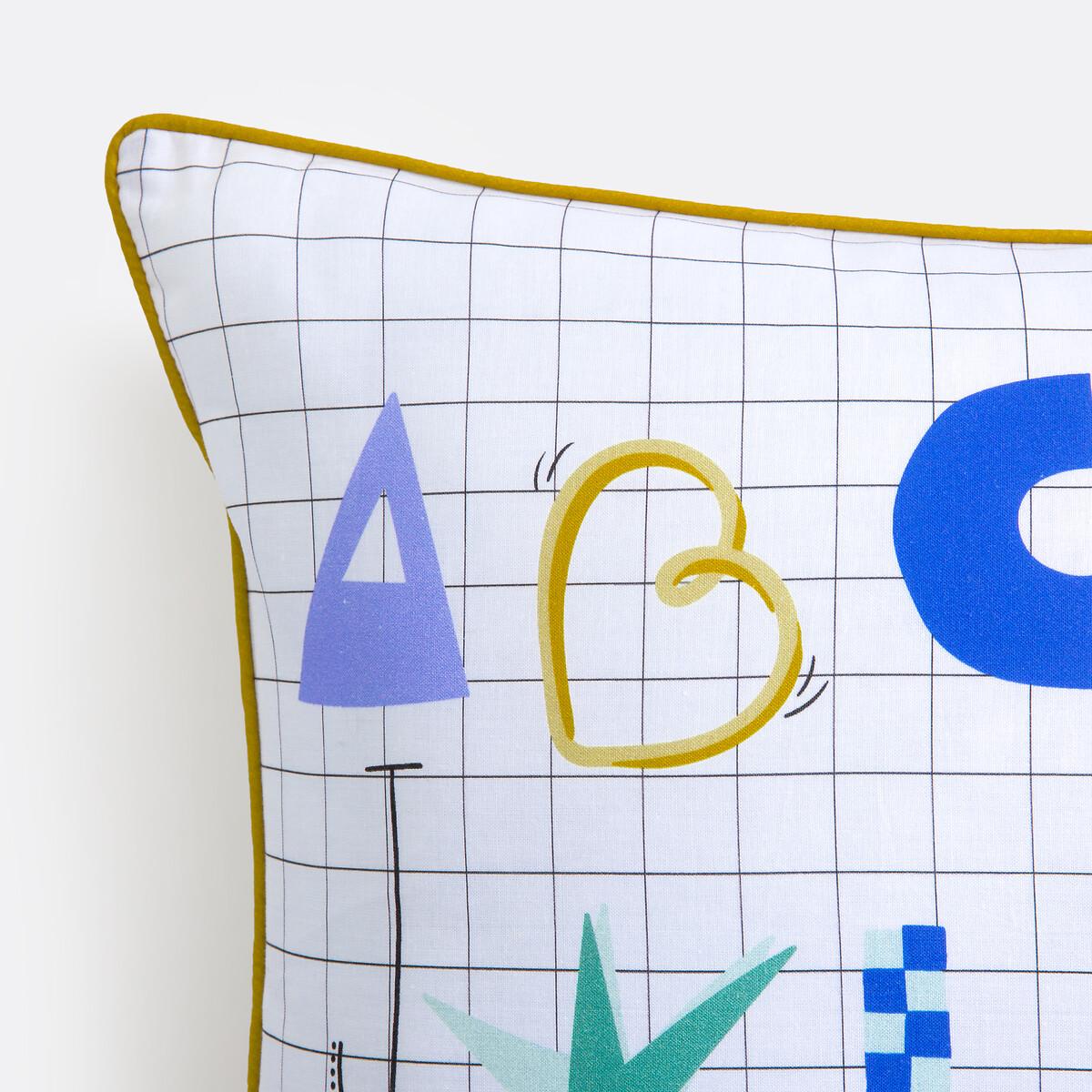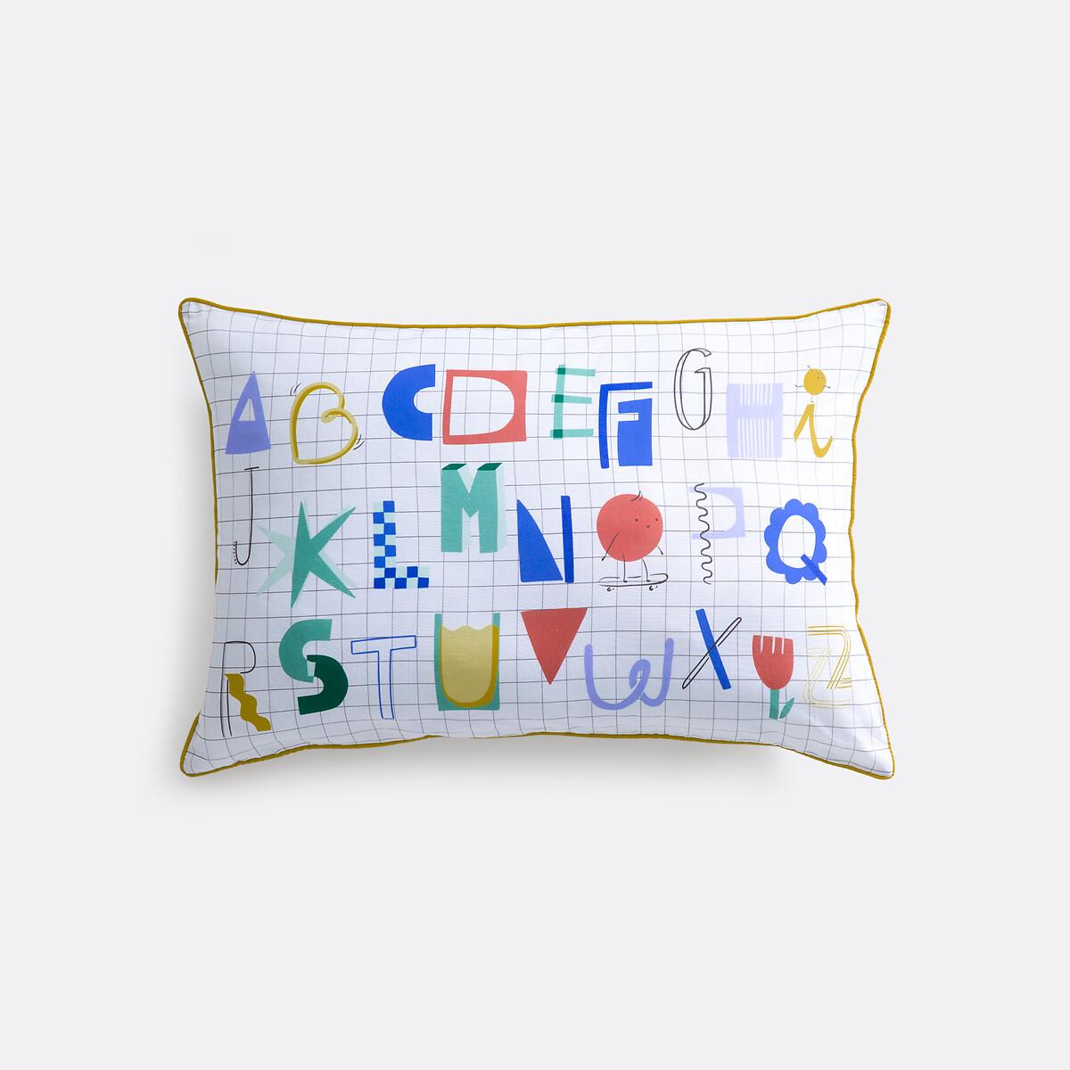 A charming cushion for dreaming, learning and playing ! On the front, an alphabet book as if hand-drawn: Each letter has its own style, like something out of a school notebook... A lovely way to discover letters in everyday life. Perfect for a child's bedroom, on a bed or reading armchair. We love: its playful, poetic spirit, ideal for creating a tender, inspiring world. Product Details • 100% cotton • Alphabet printed on both sides in a handwritten style • Plain on back • Zip fastening • Care instructions • Machine washable at 30°CDimensions • 60 x 40cm • OEKO-TEX® Standard 100. Standard 100 certification by OEKO-TEX® tests textile products for harmful substances via an independent, international label.