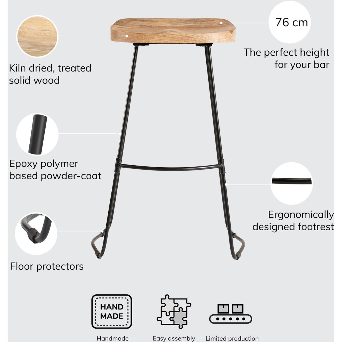 From morning breakfasts to Friday night drinks, this bar stool is here to make things stylish. Sleek metal legs combine with natural mango wood to bring design-focused beauty to your homes. Comfortable and right on trend, it embodies modern curves. The saddle seat and sculptural powder-coated legs, complete with a footrest are ergonomic details that make it a perfect option for guests to perch on as you prepare your signature dish. Handmade by skilled craftsmen, it is a winning addition to your kitchen and bar counters.
