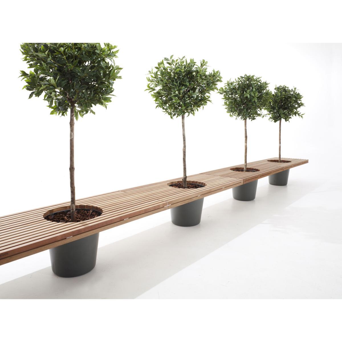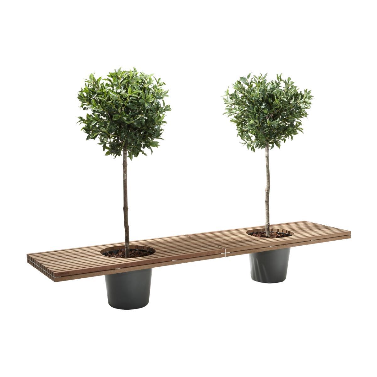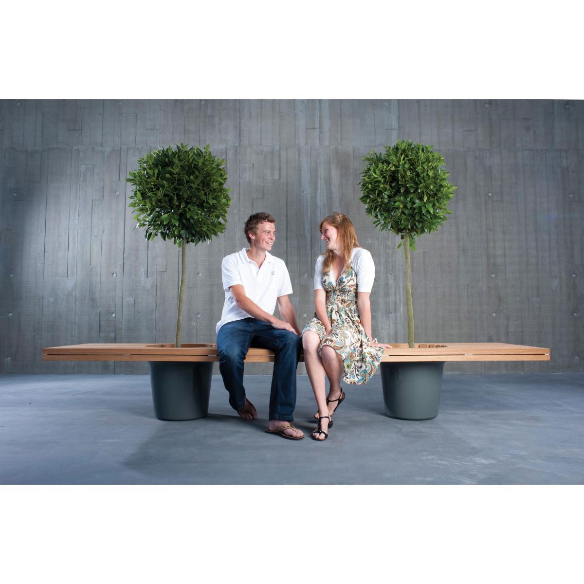 Romeo & Juliet - romance in the city. What would you do when three young architects come up with an idea that charms you straightaway? Well, then you just help them to commercialise it, don't you? In 2004 Stijn Goethals, Koen Baeyens, and Basile Graux entered Romeo & Juliet for a street furniture design competition organised by the city of Kortrijk. Their concept does not only offer passers-by a comfortable place to sit and relax, it also adds a touch of green to an often colourless urban or industrial setting. The bench is made of long square strips of wood. Two round holes in the seat create room for large flowerpots containing a small tree. Just as Romeo and Juliet, the trees are destined to be together without being able to ever touch each other. The bench seems to float between the trees. Obviously, Romeo & Juliet lends itself perfectly for the contract market: When several benches are put in line, the distance between the trees remains identical, creating architectural harmony. They are of course also perfectly suited to private gardens or patios. An added bonus is the 10 cm space between the flowerpot and the flowerpot cover, to which the bench is attached. It serves as a water reservoir, but also offers the tree roots plenty of ‘breathing space' to prevent them from rotting.