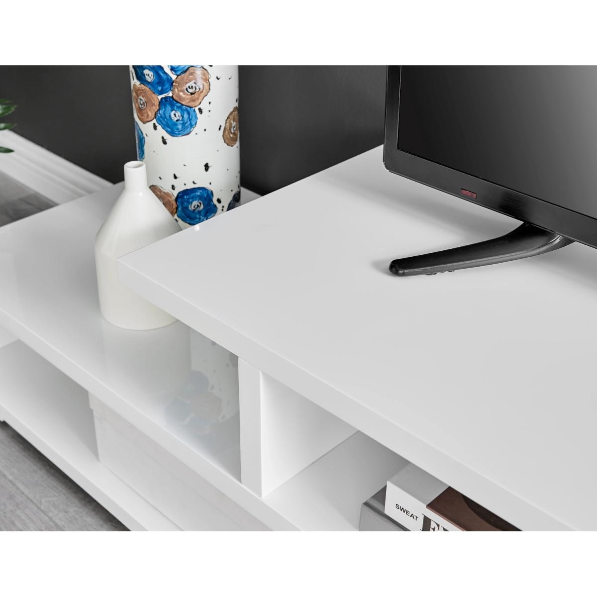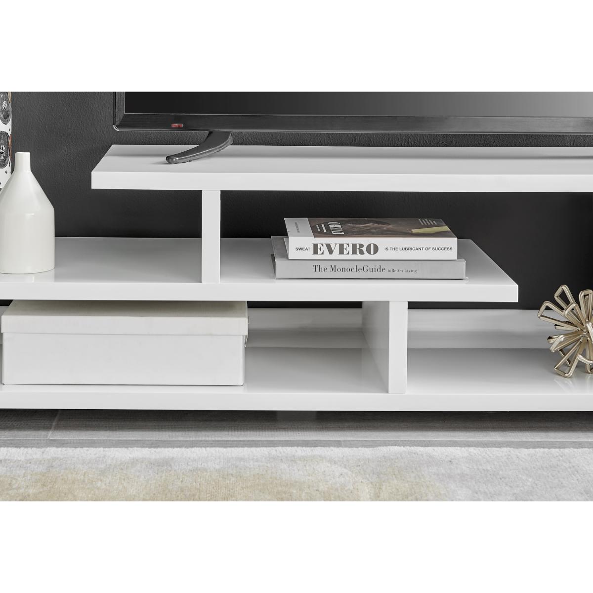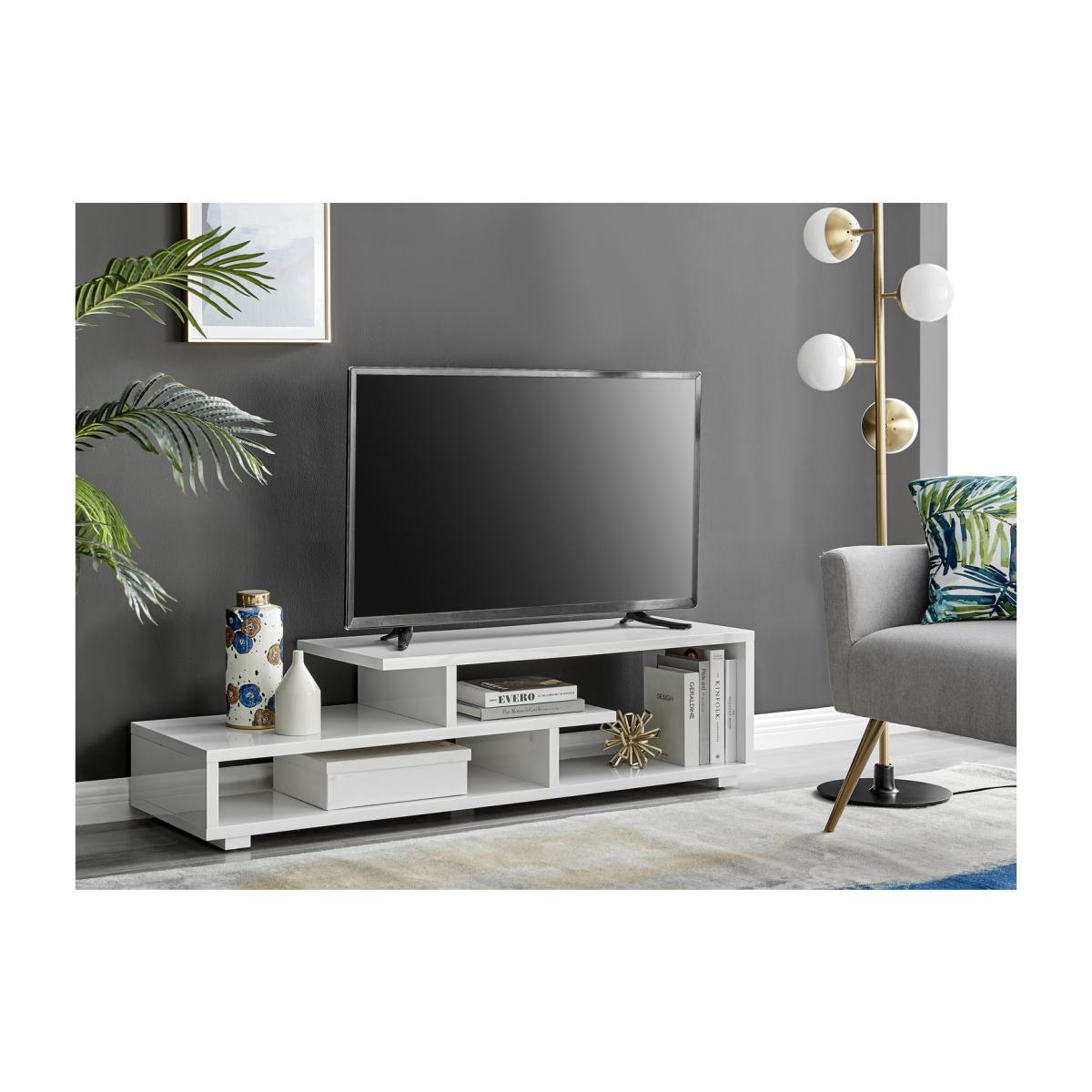 Stylishly combining slick high gloss with crisp minimalist lines, the Romera TV stand would look great in any living or bedroom space. It has a modern 'G' shaped design that can be placed facing either direction, and smooth high gloss finish, making it perfect for the modern home. The high-quality gloss finish also allows for easy wipeclean surfaces, so it's super practical too. Featuring a shelf for your TV and 3 separate 'compartments' for storage - ideal for all your consoles and remotes as well as books, and gorgeous display areas for your personal accessories too. Weight tested to 100kg, this TV stand is perfect for all TVs! The modern design really will transform your room and at such a brilliant price it cannot be beaten!